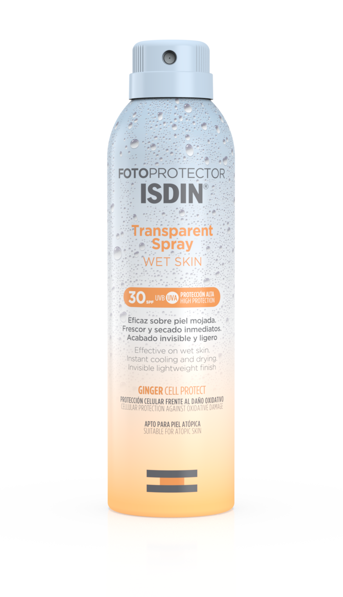ISDIN LÄBIPAISTEV PÄIKESEKAITSEAEROSOOL MÄRJALE NAHALE. Tugev kaitse SPF 50 UVB/ UVA. Tõhus märjal nahal. Veekindel. Värskendav ja jahutav läbipaistev päikesekaitsesprei imendub koheselt nahka. Kuivab koheselt, jätmata rante. GINGER CELL PROTECT: kaitseb rakke oksüdatiivsete kahjustuste eest ning stimuleerib naha loomulikku päikesekaitsevõimet. Wetflex tehnoloogia võimaldab tootel imenduda nii märjal kui ka kuival nahal, säilitades samal ajal päikesekaitsefaktori. 360º aplikaator-pumbaga spreid on mugav kasutada üle kogu keha. Dermatoloogiliselt testitud. Sobib kõigile nahatüüpidele, sh tundlikule ja atoopilisele nahale. Õlivaba. Meresõbralik. Keemilise UV-filtriga.