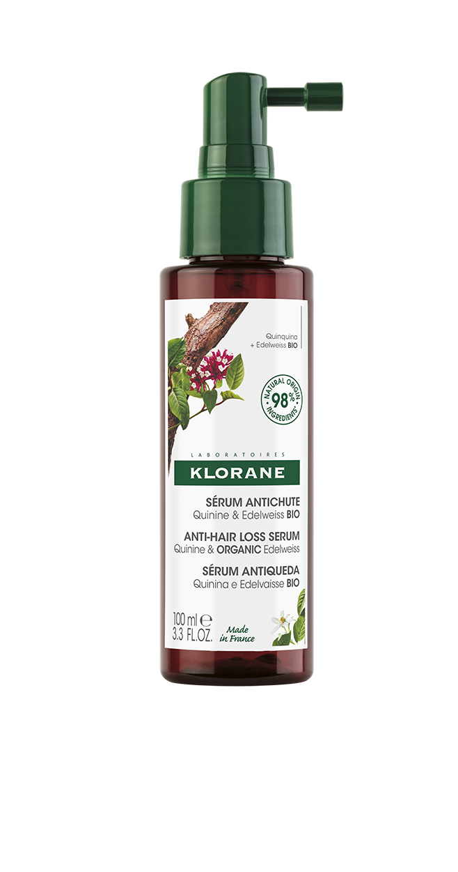 KLORANE'i kiniini ja looduslikku alpi edelveissi ekstrakti sisaldav seerum juuste väljalangemise vastu 100 ml. Stress, rasedus, kurnatus, geneetilised tegurid. Eri teguritest tingitud juuste väljalangemise vastu mõeldud tõhus kontsentraat peanahale. Juuste tugevust ja elujõudu aitavad taastada: - kiniin – kofeiin, mis parandab juuksekarvade kinnitumist peanahale ja aeglustab juuksekadu; - looduslik alpi-jänesekäpp aitab reguleerida juukse kasvutsükleid ning stimuleerib kasvu; - B-vitamiinid ja mangaan soodustavad peanaha mikrovereringet.⁴ +3000 juuksekarva¹ juba 12 kasutuskorra järel² Vähenenud juuksekadu kuu aja möödudes. Tihedamad ja vastupidavamad³ juuksed kolme kuu jooksul. 98% koostisosadest on loodusliku päritoluga. Ei sisalda loomset päritolu koostisosi. Koostist on katsetatud üle 1248 korra.⁸ Taaskasutatavatest materjalidest ja ringlussevõetav pudel. Ei sisalda silikoone ega mineraalõli. ¹ +3124 olemasolevat juuksekarva kasvufaasis. ² Keskmiste tulemuste fototrikogramm 45 osalejal, kes kogesid reaktsioonilist juuste väljalangemist ja kasutasid toodet ühe kuu vältel kolm korda nädalas. ³ Tarbijakasutuse katsed, milles osales kolme kuu jooksul 66 inimest. ⁴ Koostoimes masseerimisega. ⁵ Koostoimes mangaaniga. ⁶ In vitro katsed. ⁷ Patent WO2019/211468. ⁸ Taluvusuuring vähemalt 26 osalejaga, kes kasutasid toodet nelja kuu vältel kolm korda nädalas.
