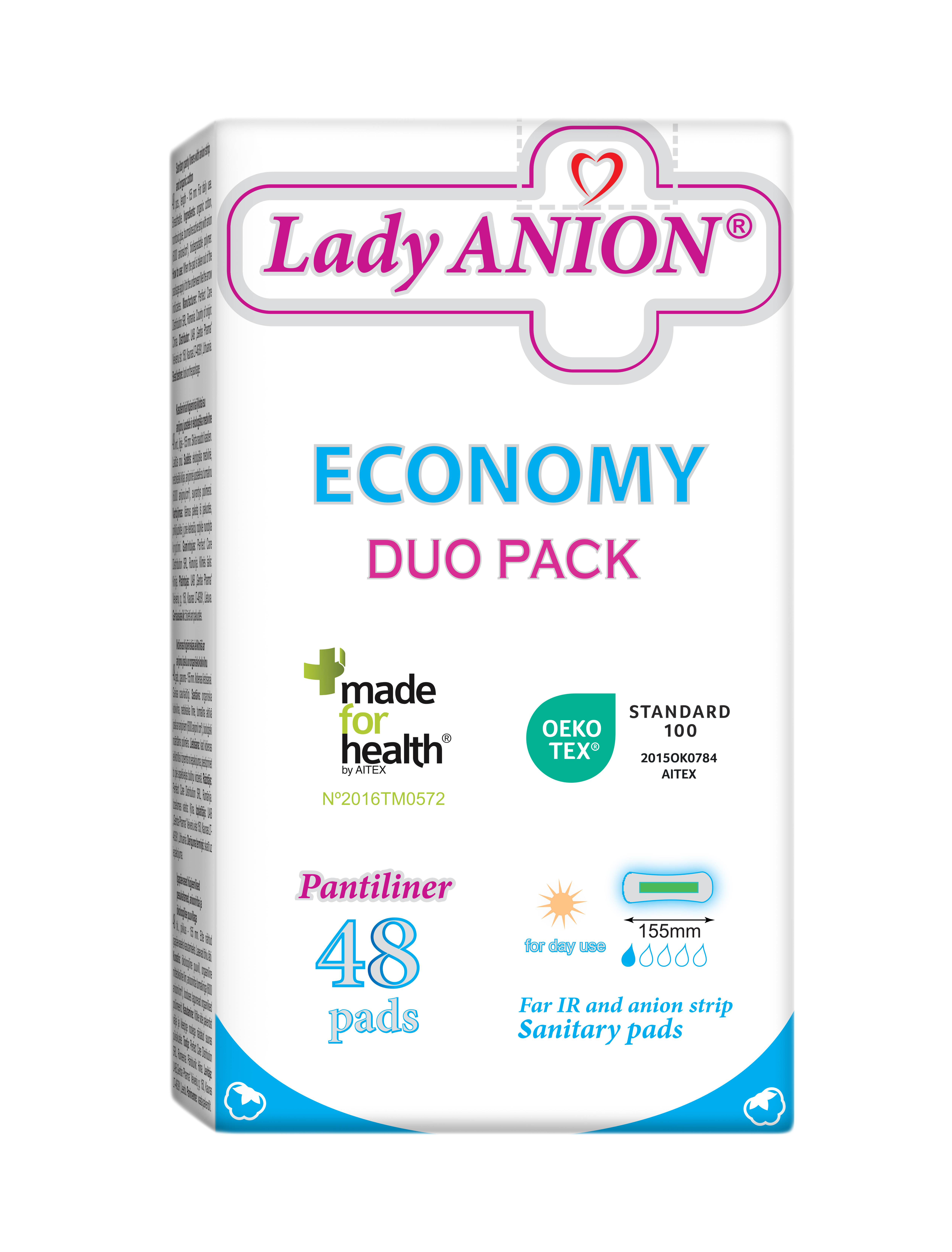 Igapäevased pesukaitsmed Lady ANION Pantiliner Pesukaitsmed igapäevaseks hügieeniksPuhtuse ja usalduse tunne iga päevImamine 16 mlPikkus 155 mmKogus pakendis 48 5 väga õhukest kihti tagavad mugavuse ja võimaldavad unustada, et kannad pesukaitset Orgaaniline puuvill loob pehmuse tunde Kompaktne kuju sobib lemmik pesuga Lady ANION valem sisaldab armastust teie mõlema vastu: LOODUSELE JA SINU HEALE ENESETUNDELEÖkoloogiline puuvillAnioonriba lõhnade kontrolliksKõrge imendumistaseLoodussõbralikudÕhku läbilaskvadGünekoloogid soovitavadSertifitseeritudValmistatud ilma nende kahjulike aineteta Pestitsiidid Raskemetallid Formaldehüüd Aromaatsed amiinid Fenoolid Ftelaadid Allergilised värvainedKONTROLLITUD JA SERTIFITSEERITUD ÖKO TEX – 100 Sertifitseeritud hügieenisidemed on kõrge kvaliteedigamugavad: pehmest puuvillas pealispindkaitsevad ebameeldiva lõhna eest: anioonriba neutraliseerib ebameeldivat lõhnailma ärritajateta: sobivad naistele, kes ei saa kanda sünteetilisi sidemeidtagavad kuivuse pikaks ajaks: kõrge imendumistase, imendumisuuringud on läbi viidud sõltumatus Prantsusmaa laborisei ole toksilised: kasutatakse mittetoksilist kleepribasoovitavad günekoloogid: kasutatakse günekoloogiapraksisesõhku läbilaskvad: õhukesed, nahk ei haudu, ei lähe kuumaksloodussõbralikud: valmistatud iseenesest lagunevatest materjalidestsertifitseeritud: Öko Tex-100, Made For Health, Bureau Veritas. Miks tasub valida sertifitseeritud hügieenisidemeid?1. Kvaliteet Sertifitseeritud pesukaitsmed on kõrge kvaliteediga.2. Ohutus Sertifitseeritud pesukaitsmed, nende pakendid ei kahjusta tervist.3. Tunnustus Rahvusvahelisi sertifikaate hinnatakse kogu maailmas.