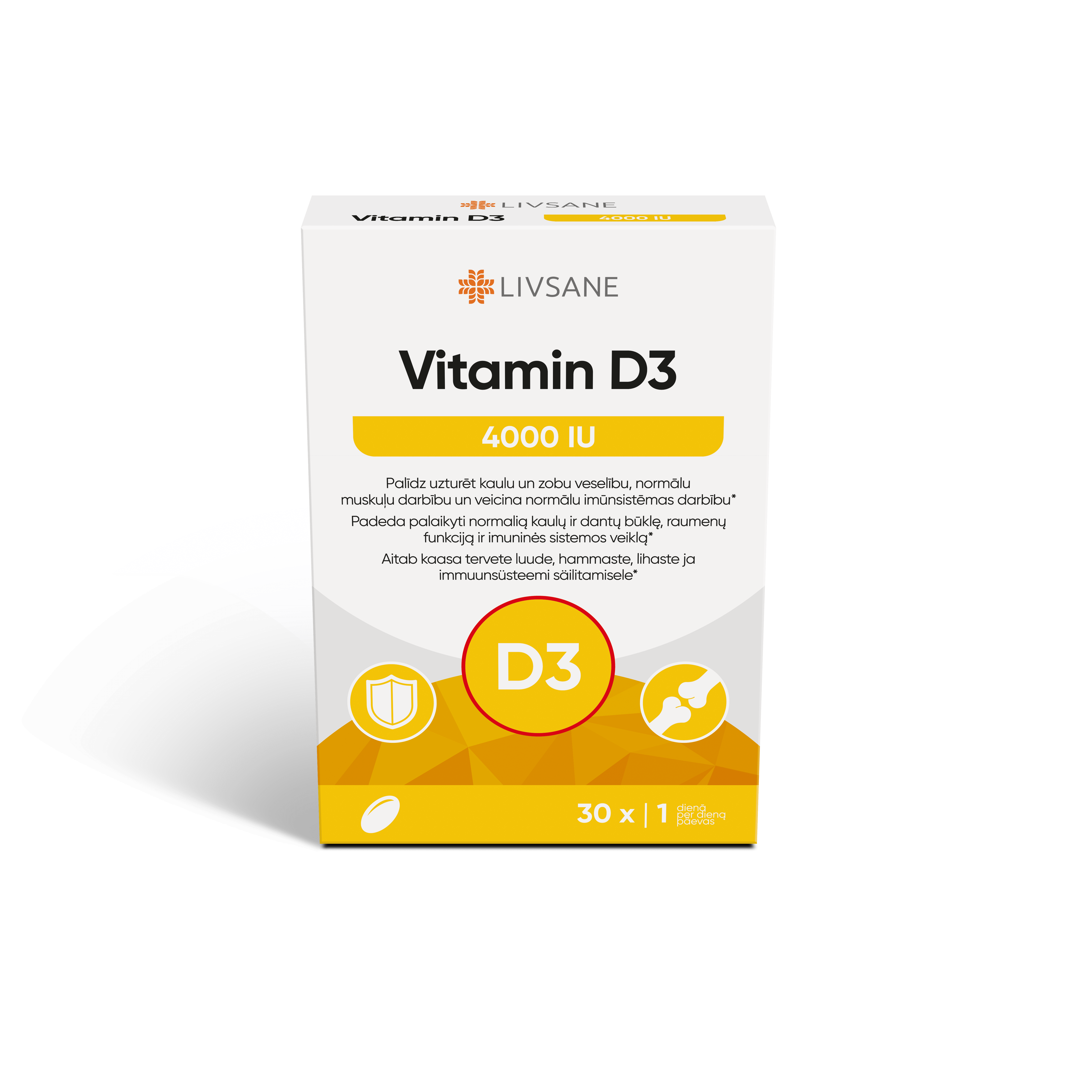 LIVSANE D3 4000IU sisaldab suure annuse D-vitamiin. D-vitamiinil on inimese organismis tervise säilitamisel suur roll. Seetõttu tõstab D-vitamiini puudus märkimisväärselt haiguste esinemise riski, eriti just talvel ja põhjapoolkeral. Vitamiin D aitab kaasa luude, hammaste ja lihaste funktsioonide säilimisele, aitab hoida vere kaltsiumisisaldust normaalsena ning toetab immuunsüsteemi tööd. Hoiatused: Oluline on toituda mitmekülgselt ja tasakaalustatult ning harrastada tervislikku elustiili!Mitte ületada päevaseks tarbimiseks soovitatavat kogust!Toidulisandit mitte kasutada mitmekesise toitumise asendajana!Hoida toodet lastele kättesaamatus kohas!