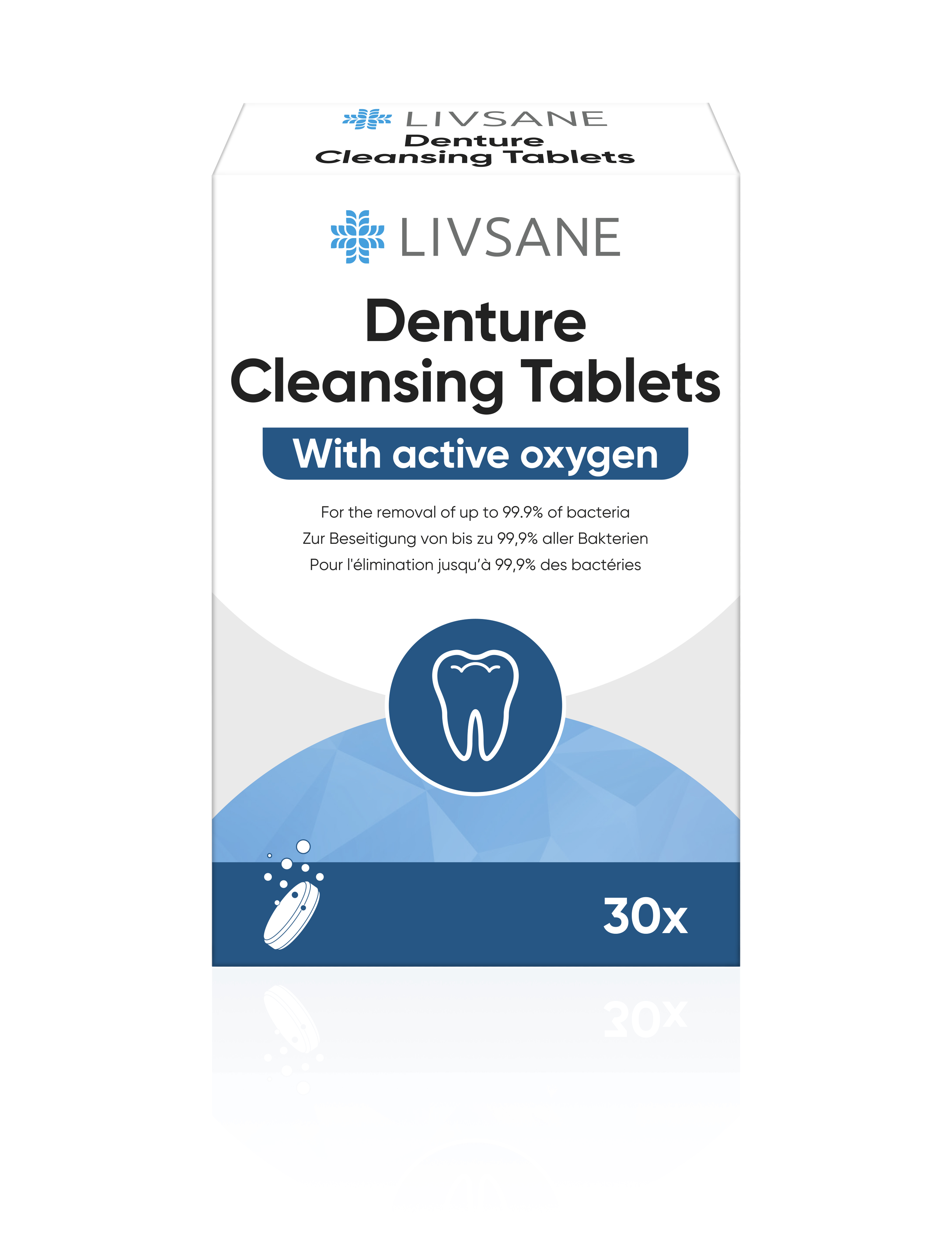 LIVSANE kihisevad puhastustabletid on mõeldud proteeside igapäevaseks puhastamiseks ja desinfitseerimiseks. Aktiivne hapnik puhastab, lahustab ja eemaldavad plekid ja katu ning aitab hoida proteesid puhaste ja säravatena. Puhastustablettidel on antibakteriaalne toime, mis tapab kuni 99.9% bakteritest. Hoiatused: Toodet tohib kasutada üksnes puhastamise eesmärgil!Tabletti ei tohi asetada suhu ega selle lahust juua!Juhul, kui mõne koostisosa suhtes esineb ülitundlikkus, ei tohi tablette kasutada!Põhjustab tõsist silmaärritust!Päras kasutamist tuleb käsi põhjalikult pesta!Hoida lastele kättesaamatus kohas!