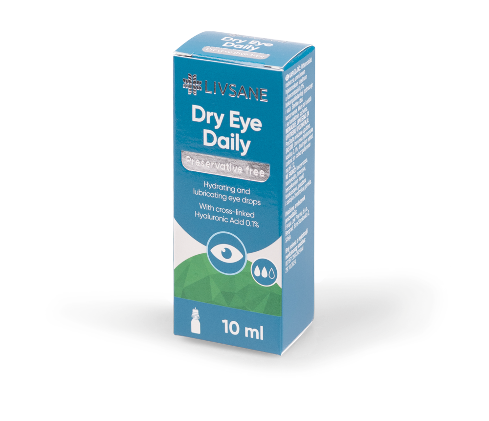 LIVSANE Dry Eye Daily silmatilgad on niisutav, libestav, bioloogiliselt ühilduv oftalmoloogiline lahus, mis sisaldab 0.1 % ristseotud hüaluroonhapet. Tilgad on steriilsed, säilitusainevabad ja need sobivad kasutamiseks ka kontaktläätsede kandjatele. HOIATUS Ärrituse tekkimisel lõpetada toote kasutamine ja võtta ühendust silmaarstiga. Mitte kasutada, kui esineb allergiaid või ülitundlikkust toote mõne komponendi suhtes. Mitte puudutada tilguti otsakuga silma pinda. Hoida eemal soojusallikatest. Mitte alla neelata. Mitte kasutada pärast aegumiskuupäeva möödumist; kasutada 180 päeva jooksul pärast avamist. Pärast iga kasutuskorda sulgeda pudel kindlalt. Mitte kasutada toodet, kui pakend tundub olevat kahjustatud.
