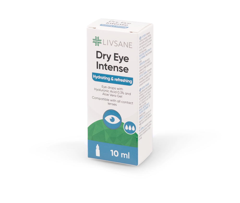 LIVSANE Dry Eye Intense silmatilgad on intensiivselt niisutav, libestav, värskendav, bioloogiliselt ühilduv oftalmoloogiline lahus, milles 0.3 % hüaluroonhape ja aloe vera geel. Tilgad on steriilsed ja sobivad kontaktläätsede kandjatele. HOIATUS Silmaärrituse korral lõpetada tilkade kasutamine ja pöörduda erialaspetsialisti poole. Mõne koostisosa suhtes allergia või ülitundlikkuse esinemisel toote kasutamine lõpetada. Tilguti otsakuga ei tohi silma pinda puudutada. Hoida eemal soojusallikatest. Mitte alla neelata. Mitte kasutada toodet pärast kõlblikkusaja lõppu. Kasutada 90 päeva jooksul pärast esmakordset avamist; steriilne kuni esmase avamiseni. Pärast kasutamist sulgeda pudel tihedalt. Juhul, kui pakend on kahjustatud, ei tohi toodet kasutada. Annustada toodet vähemalt 5 minutit enne või pärast teiste paiksete oftalmoloogiliste preparaatide annustamist.