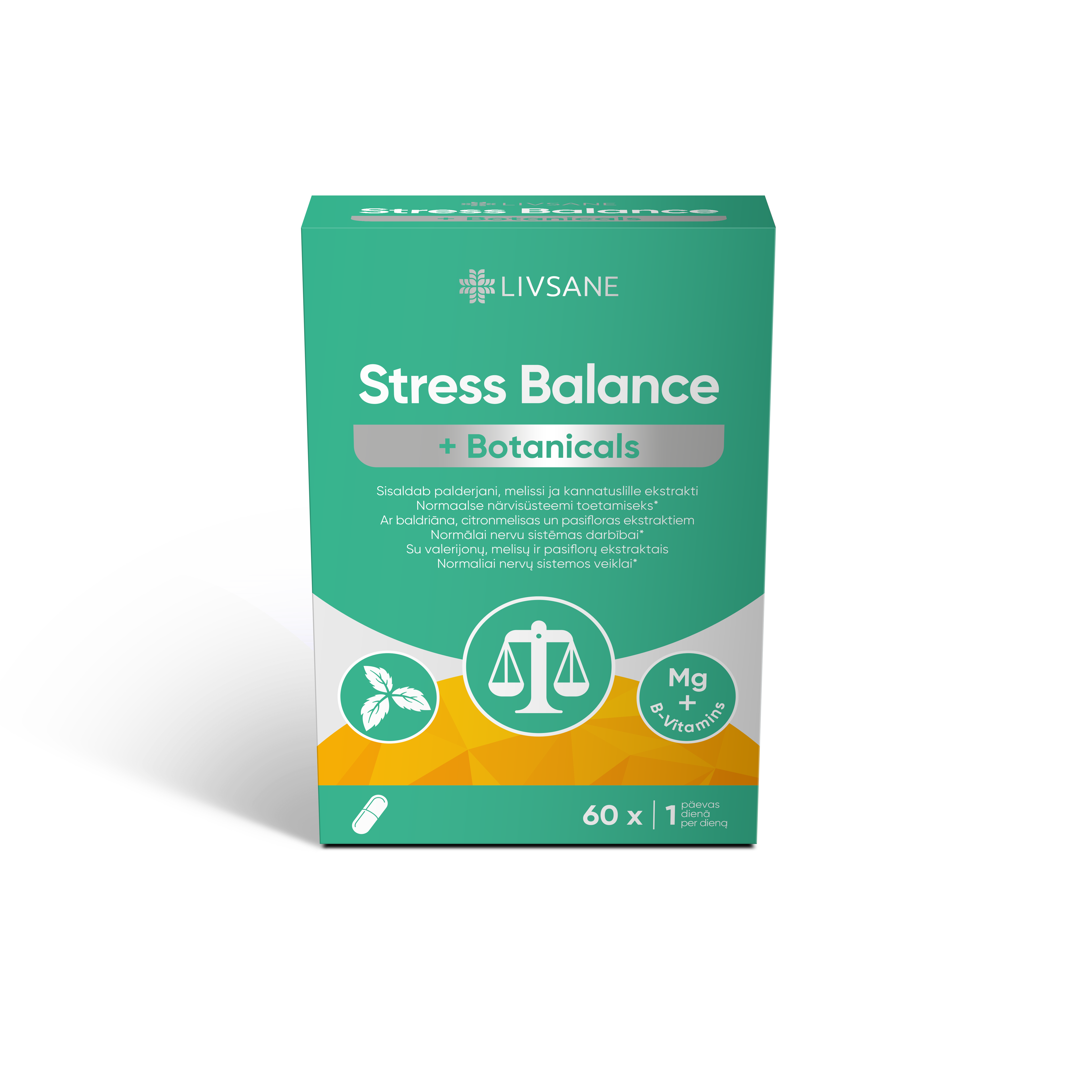 Stress, kiirustamine, ajasurve ja ületöötamine nii töös kui ka eraelus võivad viia füüsilise ja vaimse võimekuse piirideni. Stress Balance + Botanicals ühendab valitud B-vitamiinid magneesiumi, palderjanijuure ekstrakti, melissi lehe ekstrakti ja kannatuslille taime ekstraktiga, et paremini toime tulla igapäevaelu väljakutsetega. Magneesium, tiamiin, riboflaviin, vitamiin B6, niatsiin ja vitamiin B12 aitavad kaasa närvisüsteemi normaalsele toimimisele ning normaalsele energiavahetusele. Riboflaviin, niatsiin, vitamiin B6 ja B12 aitavad vähendada väsimust ja kurnatust. Magneesium, tiamiin, niatsiin, vitamiin B6 ja B12 toetavad normaalset psühholoogilist funktsiooni.