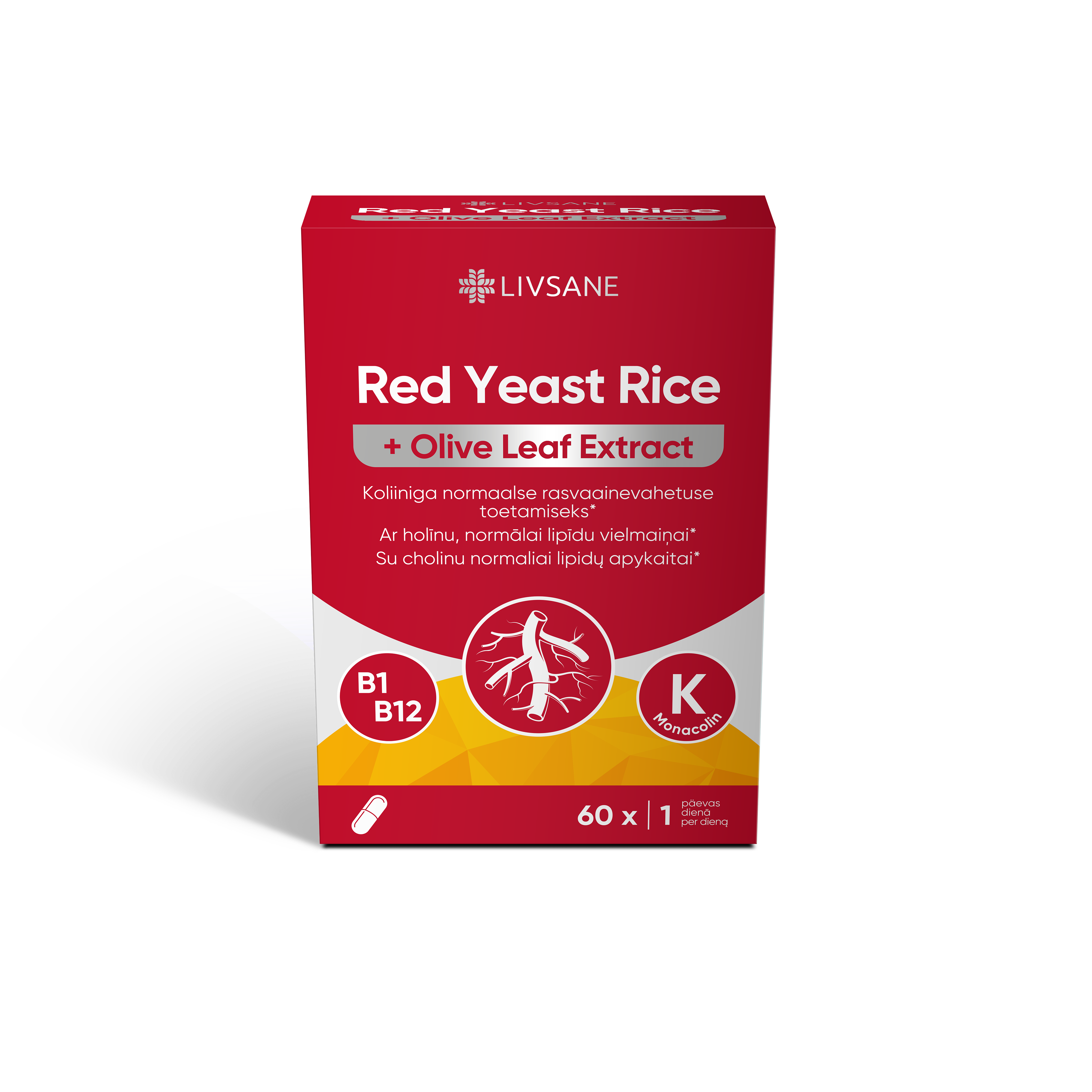 TOIDULISAND VITAMIINIDE, KOLIINI, PUNASEST FERMENTEERITUD PÄRMIRIISIST SAADUD MONAKOLIIN K JA OLIIVILEHTEDE EKSTRAKTIGA Monakoliin K saadakse punasest fermenteeritud pärmiriisist (Monascus purpureus). Oliivilehtede ekstrakt sisaldab 20% hüdroksütürosooli, mis on polüfenool. Tiamiin aitab kaasa normaalsele südametalitlusele. Vitamiin B12 aitab kaasa homotsüsteiini normaalsele ainevahetusele, vere punaliblede normaalsele moodustumisele ja normaalsele energiavahetusele. *Koliin aitab kaasa normaalsele rasvaainevahetusele ja homotsüsteiini normaalsele ainevahetusele ning aitab säilitada normaalset maksa talitlust. Hoiatused: Mitte tarbida päevas 3 mg või rohkem punasest fermenteeritud pärmiriisist saadud monakoliine. Ei sobi tarbimiseks rasedatele või imetavatele naistele, alla 18-aastastele lastele ja üle 70-aastastele täiskasvanutele. Kui teil tekib selle toote tarbimise ajal terviseprobleeme, pöörduge arsti poole. Mitte tarbida, kui võtate kolesterooli vähendavaid ravimeid või muid punast fermenteeritud pärmiriisi sisaldavaid tooteid.