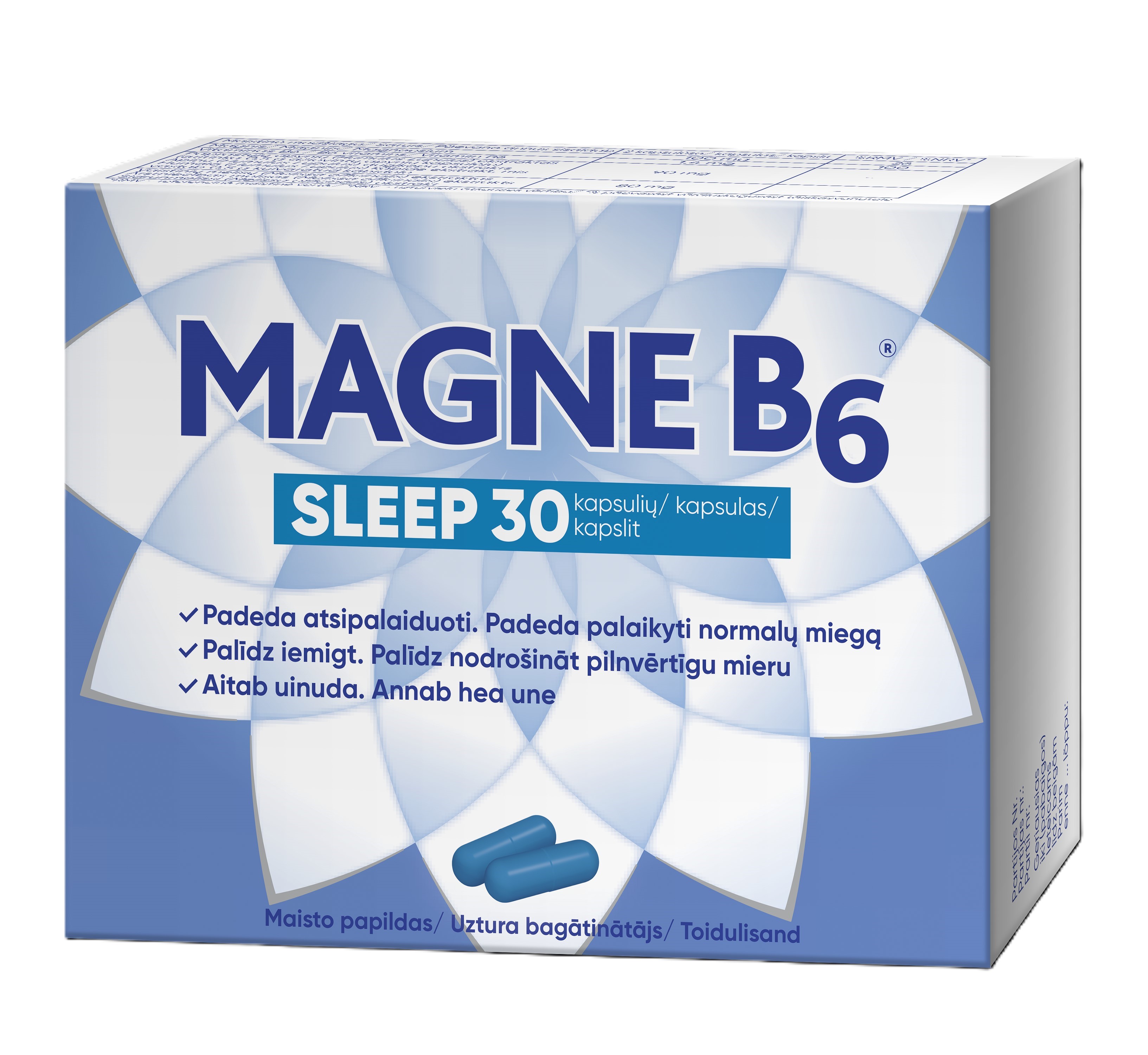 MAGNE B6 sisaldab valitud taimeekstrakte koos magneesiumi ja B6-vitamiiniga, mis üheskoos parandavad une kvaliteeti ja aitavad uinuda. Humalal on lõdvestav ja füüsilist heaolu toetav toime ning see aitab une kvaliteedile kaasa. Sidrunmeliss aitab lõdvestuda ja püsida sügavas unes. Lisaks sisaldab toidulisand magneesiumi ja B6-vitamiini, mis vähendavad väsimus- ja kurnatustunnet. Hoiatused: Ei sobi alla 18-aastastele lastele, sest puuduvad piisavad andmed!Ärge kasutage toodet, kui teil esineb allergiat mõne koostisosa vastu!Oluline on toituda mitmekülgselt ja tasakaalustatult ning harrastada tervislikku elustiili! Mitte ületada päevaseks tarbimiseks soovitatavat kogust! Toidulisandit mitte kasutada mitmekesise toitumise asendajana! Hoida toodet lastele kättesaamatus kohas!