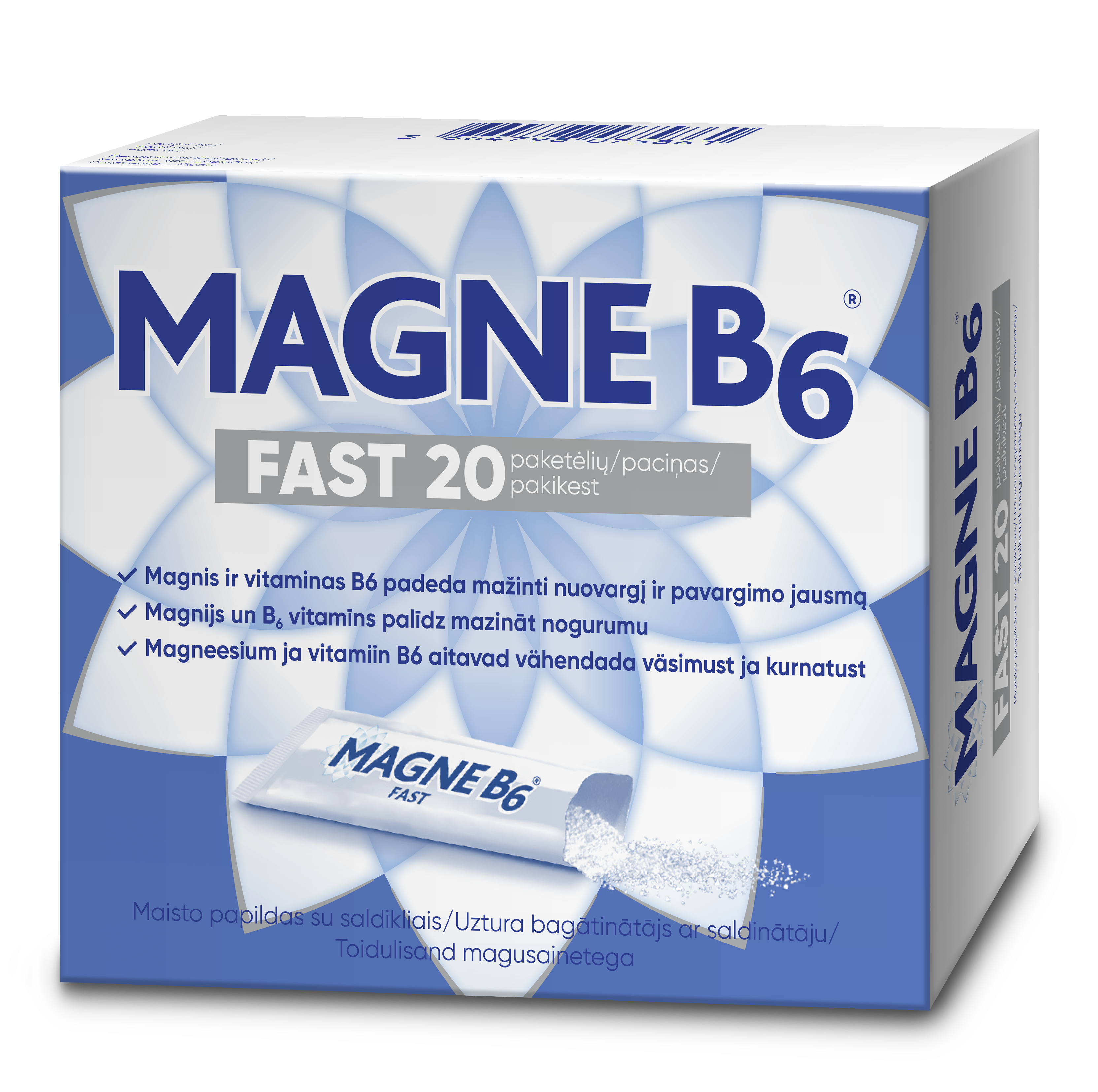 Tablett sisaldab magneesiumi magneesiumkarbonaadi ja oksiidina. Vees lahustatud tablett annab värske sidrunimaitselise joogi suure magneesiumi sisaldusega. Mugav juua voodis, kui teil on öösel lihaskrambid. Magneesium on vajalik mineraal luudele, lihastele, südamele, vereringele ja närvisüsteemile. Magneesium on rakusiseselt seotud rohkem kui 300 biokeemilise ensümaatilise reaktsiooniga. Magneesium aitab kaasa elektrolüütide tasakaalule, normaalsele energiavahetusele ja normaalsele valgusünteesile. Magneesium aitab kaasa ka lihaste ja närvisüsteemi normaalsele toimimisele ning aitab hoida luid ja hambaid normaalsetena. Magneesium aitab vähendada väsimust ja kurnatust.Magneesiumi-vitamiini B6 lisand on kasulik sportlastele ja füüsiliselt aktiivsetele inimestele jõudluse säilitamiseks lihastes. Magneesium ja vitamiin B6 mõlemad aitavad kaasa normaalsele energia ainevahetusele, lisaks aitab B6-vitamiin kaasa normaalsele valgu ja glükogeeni (säilitab glükoosi lihastes) ainevahetusele. Magneesiumi soovituslik päevane tarbimine täiskasvanutele on 280-350 mg. Kuid stress, füüsiline koormus, ühekülgne toitumine, haigustest taastumine ja diabeet suurendavad magneesiumi vajadust.