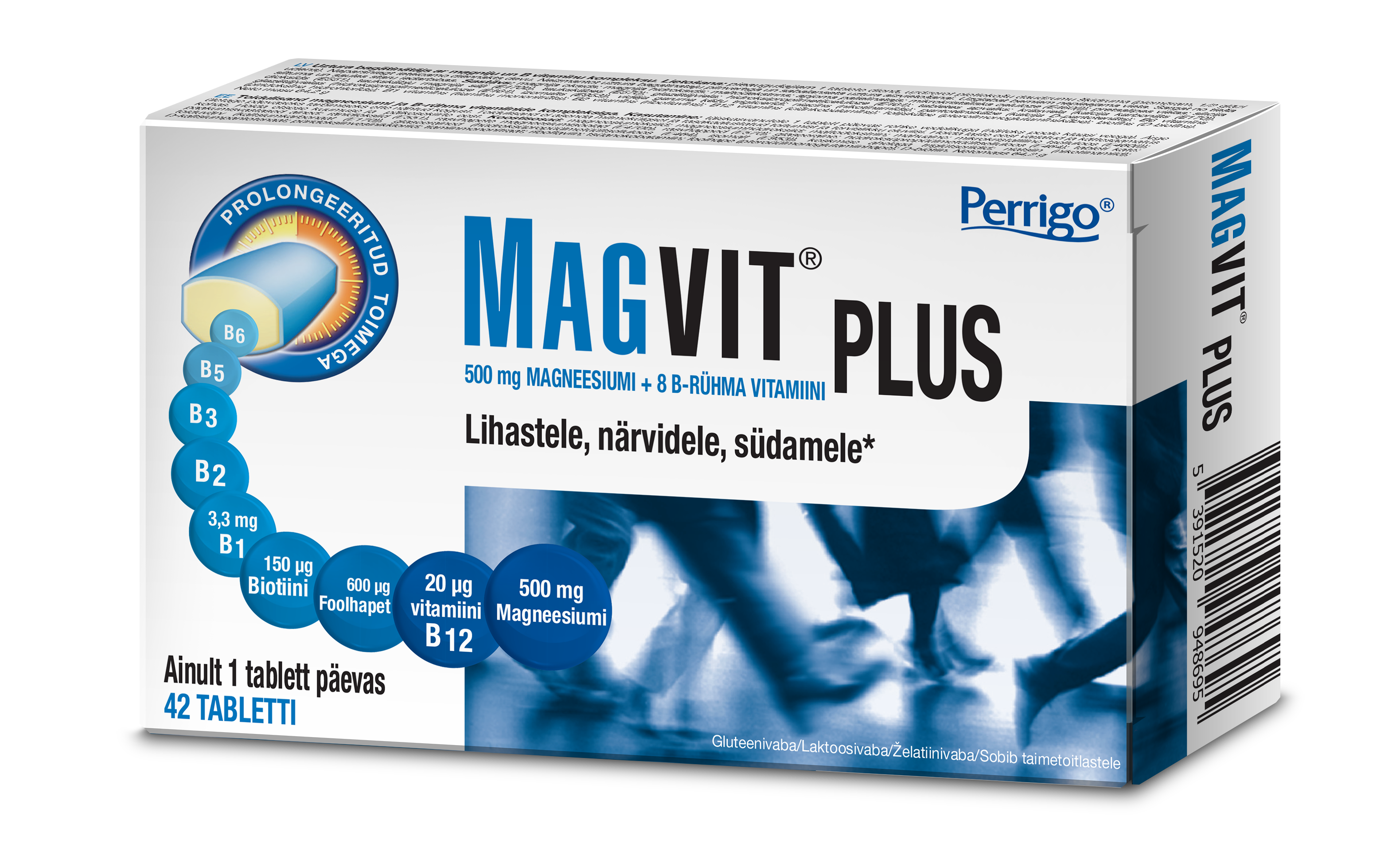 MAGVIT Plus toidulisand magneesiumi ja kaheksa B-rühma vitamiiniga. Magneesium, biotiin ja niatsiin toetavad ainevahetust ja närvisüsteemi normaalset talitlust. Vitamiin B1 aitab kaasa normaalsele südametalitlusele. Magneesium ja vitamiin B12 aitavad vähendada väsimust ja kurnatust. Depoo-tehnoloogia tagab magneesiumi ja B-vitamiinide pideva vabanemise mitme tunni jooksul, kindlustades optimaalse kasutamise ja kasuliku mõju. Hoiatused: Oluline on toituda mitmekülgselt ja tasakaalustatult ning harrastada tervislikku elustiili! Mitte ületada päevaseks tarbimiseks soovitatavat kogust! Toidulisandit mitte kasutada mitmekesise toitumise asendajana! Hoida toodet lastele kättesaamatus kohas!