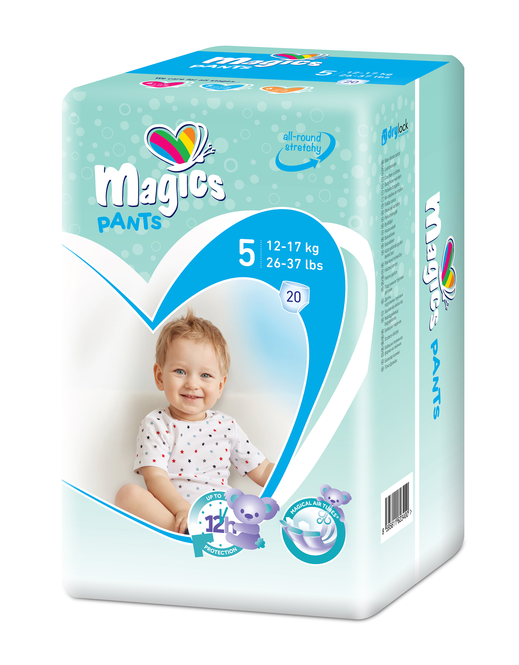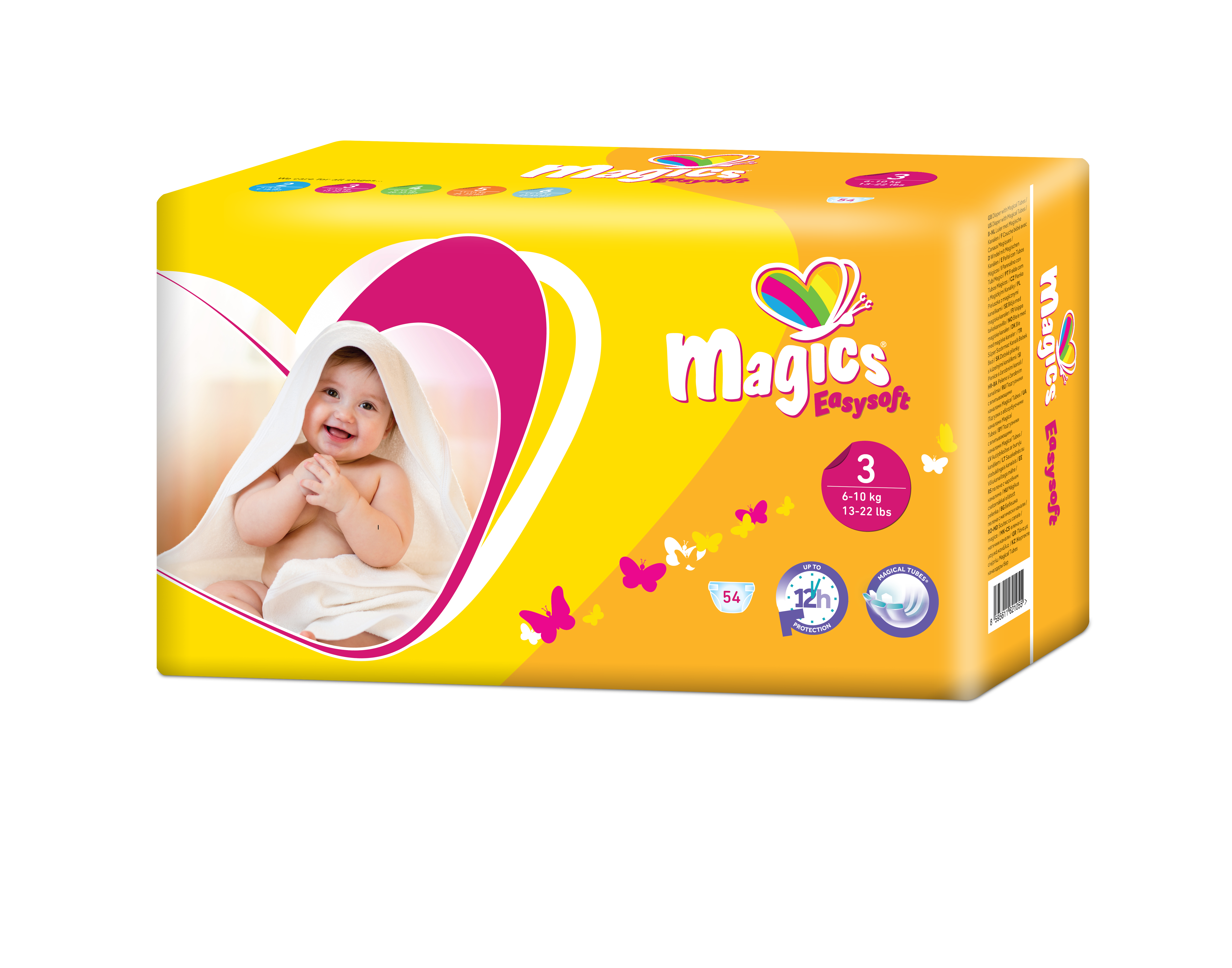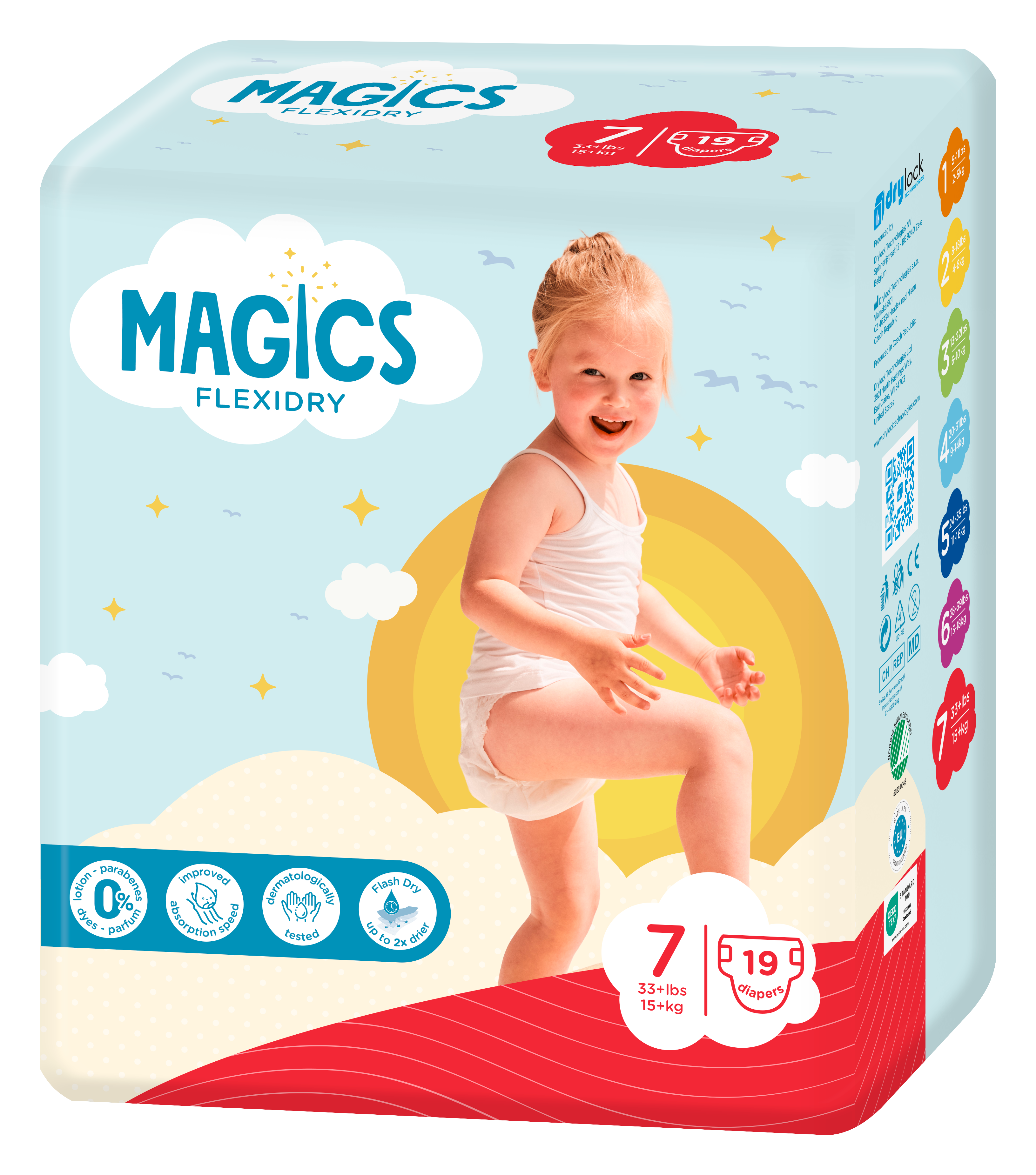 Teipmähkmed lastele Mitmekordne (rohkem kui 3 korda) kinnitus Paindlikud kaitsebarjäärid jalaavade ääres täiendava lekkekaitse tagamiseks Superdry imav kiht, mis tagab kuiva kontaktpinna MAGICAL TUBES tehnoloogia torudega ja FLASH DRY tehnoloogia – täiendavad lekkevastased süsteemid, mis aitavad kiirendada imendumist, maksimeerida imendumist ja hoida vedelikku sees; vähendab niiskusega kokkupuuteaega, tagab kiire kuivuse. Pehme ja 100% hingav materjal kõigil pindadel Elastne riba ees ja taga Pealiskiht 100% biolagunev, valmistatud taastuvatest ressurssidest Anatoomilise kujuga mähkme keskosa Niiskuseindikaator Dermatoloogiliselt testitud; Hüpoallergeenne Lateksivaba, kloorivaba, kreemivaba, parfüümivaba Toodetud ISO13485 ja PEFC sertifikaadiga tehases OEKO-TEX „MADE IN GREEN” EL-i poolt tunnustatud ökomärgis CO₂-neutraalne tootmine Ökomärgis ECOVADIS PLATINUM märgisega toode