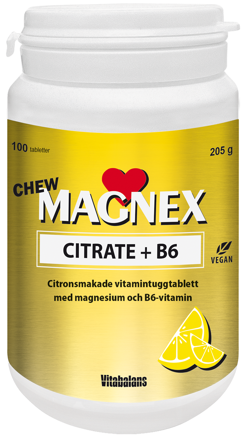 Magnex Citrate 375 mg + B6 CHEW on värske sidruni maitsega närimistablett, mis sisaldab hästi imenduvat magneesiumi ja B6 vitamiini. Kaks närimistabletti päevas annab 375 mg magneesiumi ja 3 mg B6 vitamiini.