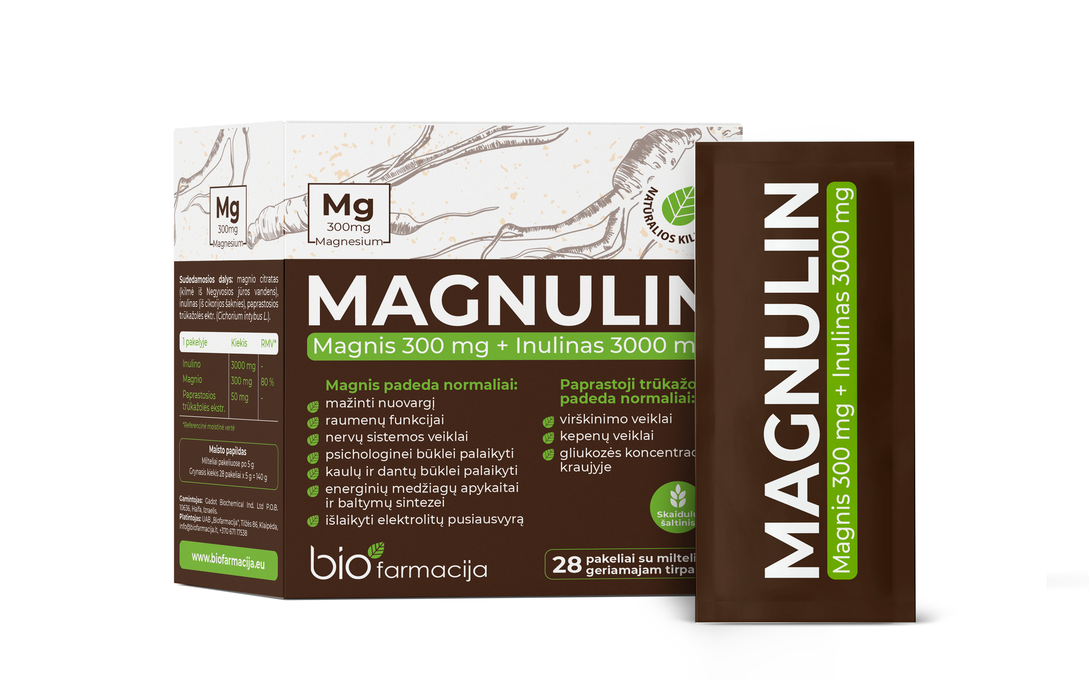 Magneesium ja inuliin seedimise toetuseks ja maksa funktsioonile! Sobib ka taimetoitlastele, veganitele ja diabeetikutele. Loodusliku päritoluga, sigurijuurest saadud inuliinil on mitmeid kasulikke aspekte, mis toetavad üldist tervist ja heaolu. Looduslikku päritolu inuliin on lahustuv kiudaine ja prebiootikum, mis soodustab kasulike bakterite kasvu soolestikus. Kiudaineid on täiskasvanutele igapäevaselt soovituslik tarbida 25-35g. Inuliin toetab seedesüsteemi, maksa funktsiooni, veresoonkonda ja üleüldist tervist. Harilik sigur: – on kasulik seedimisele – toetab maksa funktsiooni. Magneesium: – aitab vähendada väsimust ja kurnatust – aitab hoida luid normaalsena. Magneesium aitab kaasa: – normaalsele energiavahetusele – elektrolüütide tasakaalule – närvisüsteemi normaalsele talitlusele – normaalsele lihaste tööle. KEEMILISTE LISAAINETEVABA TOODE! Toidulisand ei sisalda kunstlikke magus-, värv-, maitse-ja säilitusaineid, stabilisaatoreid, paksendajaid ega emulgaatoreid.