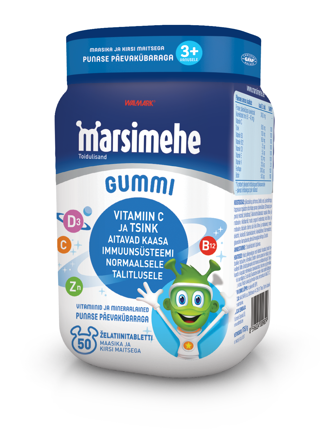 MARSIMEHE želatiintabletid lastele sisaldavad olulisi vitamiine ja punase päevakübara (Echinacea purpurea) ekstrakti, samuti tsinki, mis aitavad kaasa immuunsüsteemi normaalsele talitlusele. Vitamiin C ja tsink aitavad kaasa immuunsüsteemi normaalsele talitlusele. Hoiatused: Oluline on toituda mitmekülgselt ja tasakaalustatult ning harrastada tervislikku elustiili! Mitte ületada päevaseks tarbimiseks soovitatavat kogust! Toidulisandit mitte kasutada mitmekesise toitumise asendajana! Hoida toodet lastele kättesaamatus kohas!Mitte anda alla 3-aastastele lastele!
