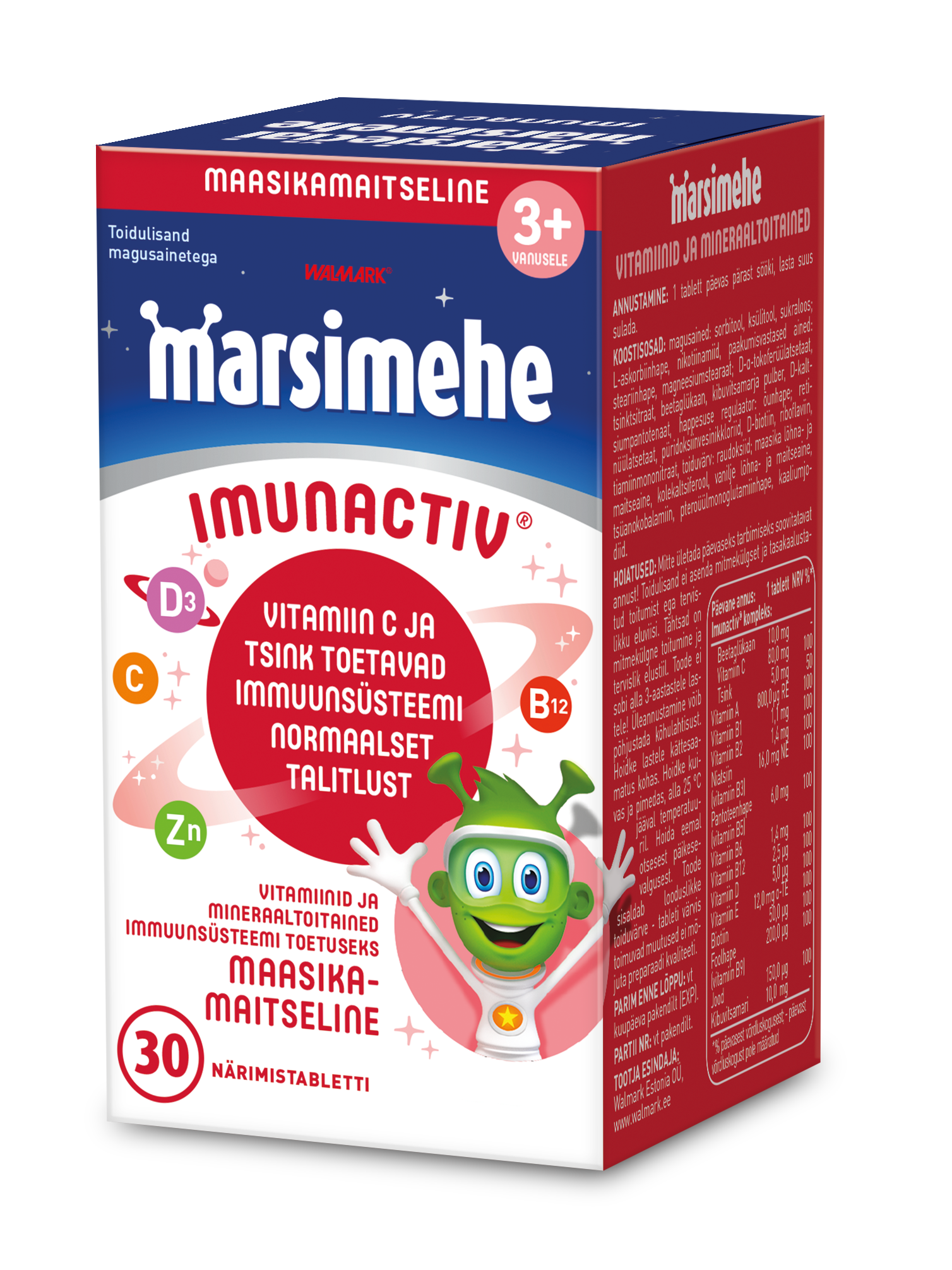 MARSIMEHE Imunactiv väikesed maasikamaitselised imemistabletid on lastele mõeldud vitamiinide ja mineraalainete kompleks. Iga tablett sisaldab soovitatavas päevases koguses vitamiine, mineraalaineid, mis on vajalikud lapse kasvu ja arengu jaoks. Lisaks sisaldab toode kompleksi Imunactiv®, mis koosneb beetaglükaanist, C-vitamiinist ja tsingist. Vitamiin C ja tsink aitavad kaasa immuunsüsteemi normaalsele talitlusele. Marsimehe vitamiinid sisaldavad ka ksülitooli, mis lisab tablettidele maitsva jahutava maitse. Hoiatused: Toode ei sobi alla 3-aastastele lastele!Üleannustamine võib põhjustada kõhulahtisust!Hoidke lastele kättesaamatus kohas!Oluline on toituda mitmekülgselt ja tasakaalustatult ning harrastada tervislikku elustiili! Mitte ületada päevaseks tarbimiseks soovitatavat kogust! Toidulisandit mitte kasutada mitmekesise toitumise asendajana!