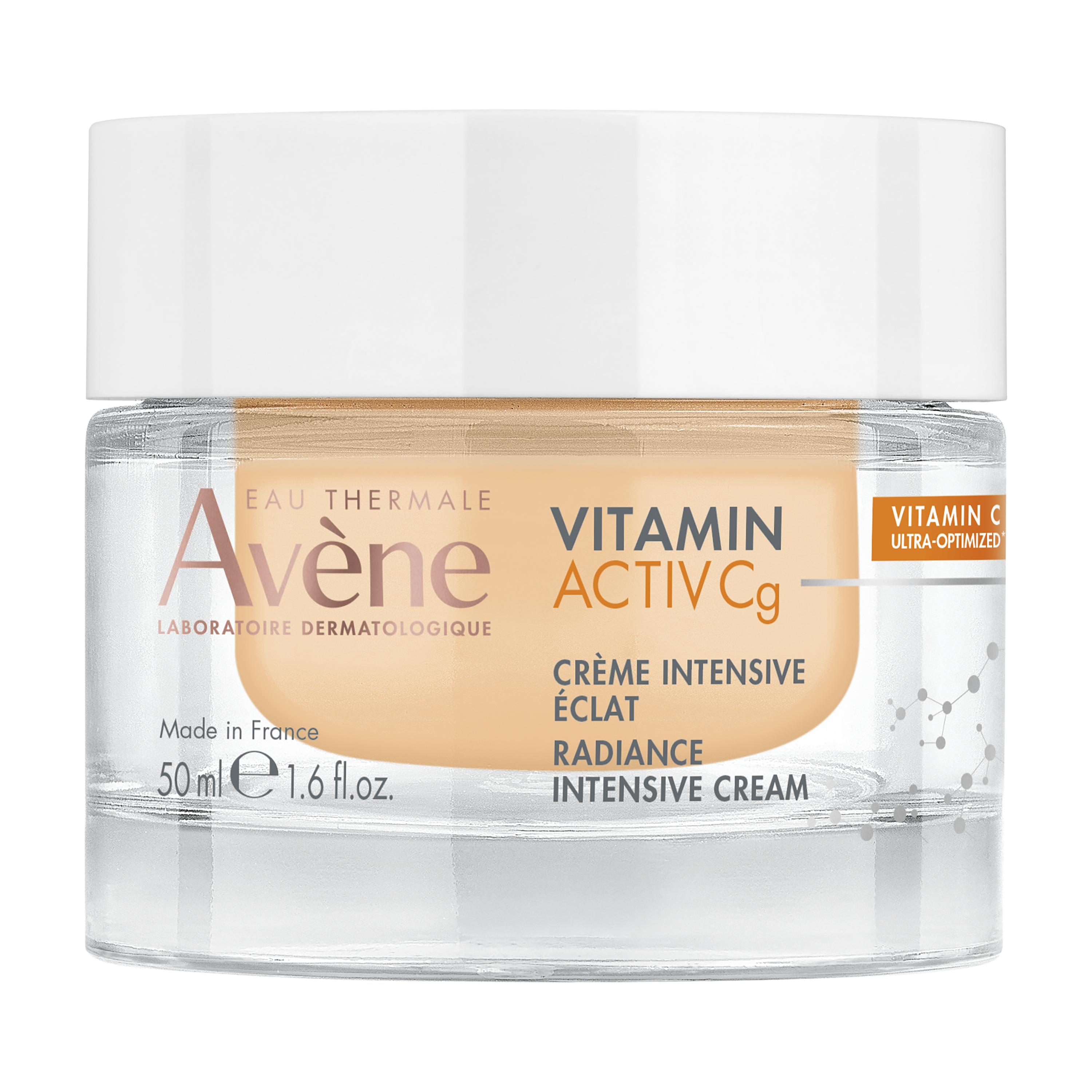 AVENE VITAMIN ACTIV Cg sära andev intensiivne kreem 50 ml Klaaristab jumet, silub kortse EKSKLUSIIVNE KOOSTIS [Cg-vitamiin – niatsiinamiid] NÄIDUSTUSED: kortsud ja peened jooned. Sära puudumine. Ebaühtlane nahatoon ja tekstuur. Pigmendilaigud. INNOVATSIOON: sära lisav niisutaja, mis sisaldab kolme kontsentreeritud dermatoloogilist toimeainet: [Cg-vitamiin*] 1,8%. Antioksüdantne efektiivsus võrdub 20% C-vitamiini toimega**. [Niatsiinamiid] 6%. Tuntud ka kui vit. B3, stimuleerib rakke ja pikendab nende eluiga***. [Hüaluroonhape]: puhas, loodusliku päritoluga, niisutab, silub ja pinguldab nahka. Sametine tekstuur. * Askorbüülglükosiid, väga stabiilne C-vitamiini vorm. ** Toodete ex-vivo test. *** In vitro test. TULEMUSED: nahk muutub koheselt siledaks ja säravaks¹. 15 päeva pärast on nahk pinguldunud ja taastunud, jume ühtlane. 1 kuu pärast on pigmendilaigud ja kortsud vähem märgatavad². ¹Testitud reaalsetes tingimustes 65 tarbijaga. ²Instrumentaalsed mõõtmised 40 katsealusel, 2 kasutamist päevas. Testitud tundlikul nahal. 93% looduslikku päritolu koostisosi. Ei sisalda loomset päritolu koostisosi. Taastäidetav purk. Valmistatud Prantsusmaal.