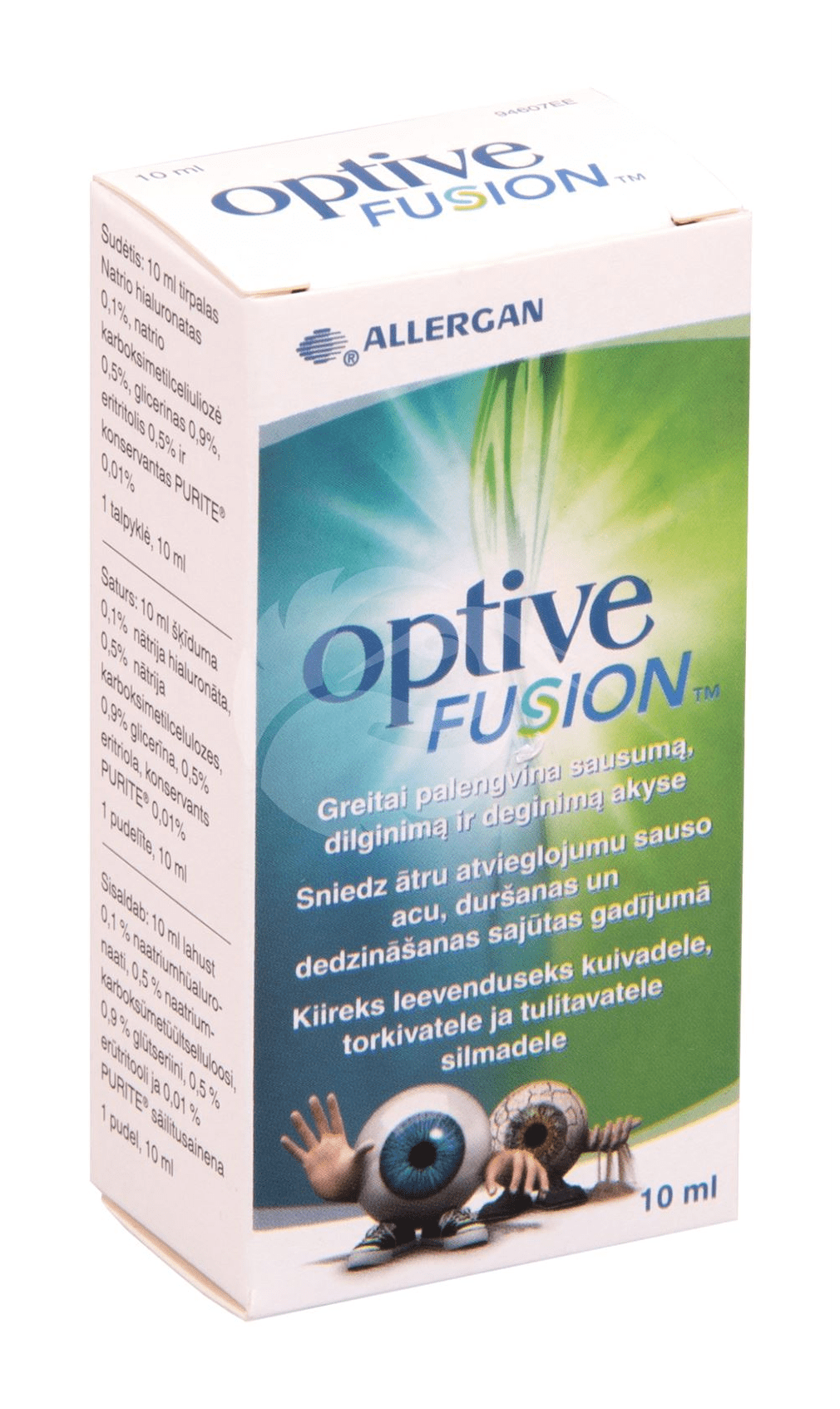 Optive Fusion silmatilgad pakuvad kuiva silma sündroomile kohest leevendust, suuremat mugavustunnet ja kestvat kaitset tänu oma unikaalsele koostisele. Silmatilkades on kasutatud kombinatsiooni kahest oftalmoloogias enim kasutatavast polümeerist/lubrikandist CMC (karboksüülmetüültselluloos) + HA ( hüaluroonhape) ning osmoprotektoritest. Tänu ainulaadsele koostisele on: -Kohene efekt kuiva silma sümptomitele -24h maksimaalne silmapealispinda niisutav ja libestav toime -silma pisarakile rakkude kaitse hävimise ja põletiku tekke eest tanu osmoprotektoritele -sobib kasutada koos kõikide kontaktläätsedega -säilib avatuna 6 kuud -säilitusaineks on ohutu PURITE