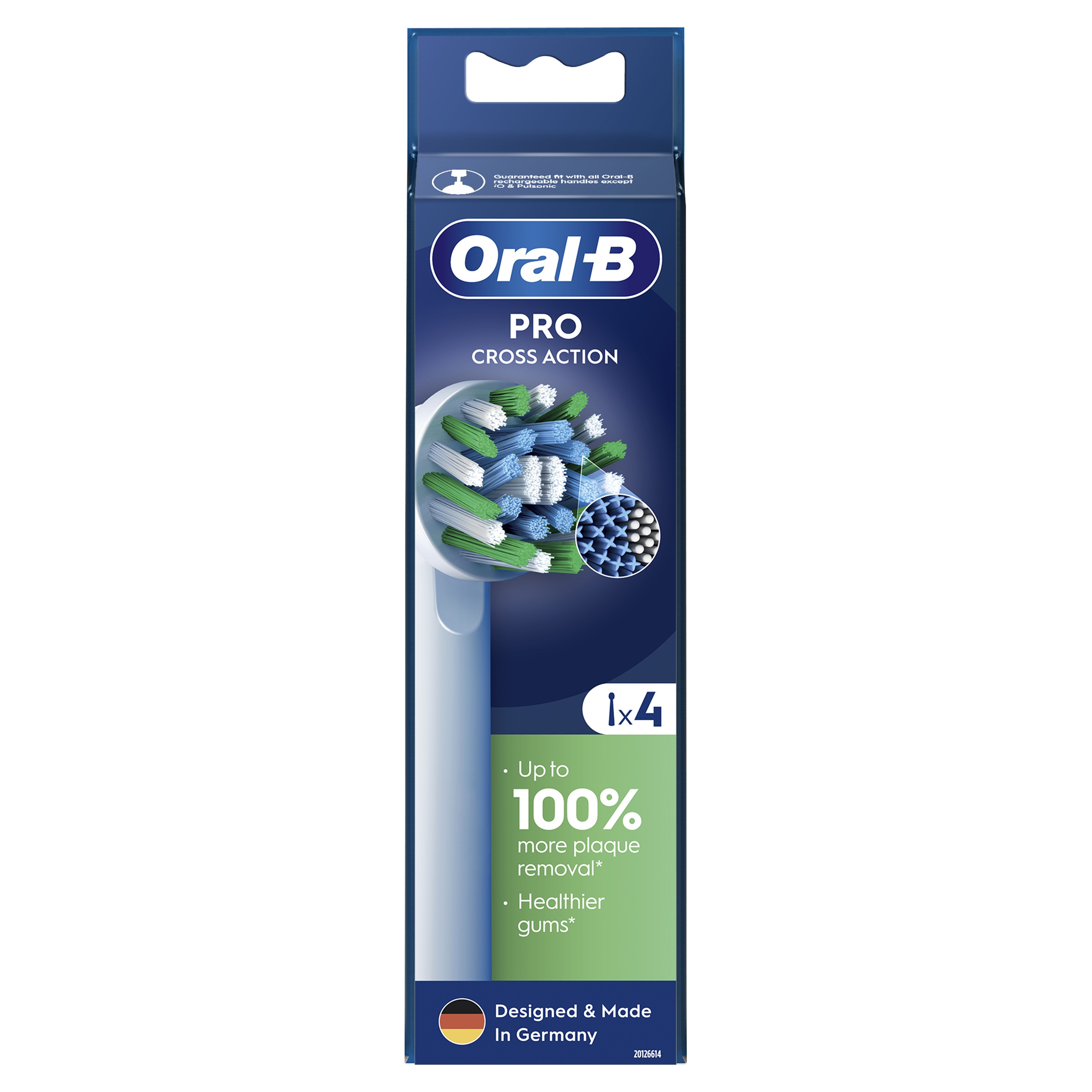Oral-B Pro Cross Action hambaharjapea sisaldab enam kui 2200 täiusliku nurga all olevat harjast, mis võrreldes hambaharjaga eemaldavad kuni 100% rohkem bakteriaalset hambakattu ning tagab puhtamad hambad & tervemad igemed. Oral-B originaalsed harjapead on disainitud uute X-kujuliste harjastega, mis puhastavad kohti, kuhu ümarad harjased ei ulatu. Selle harjapea kasutusindikaator muudab harjased rohelisest kollaseks, näidates, millal vahetada hambaharjapea 100% puhastustõhususe saavutamiseks. Garanteeritud ühilduvus kõigi Oral-B laetavate elektrihambaharjadega, välja arvatud Pulsonic & iO hambaharjad.