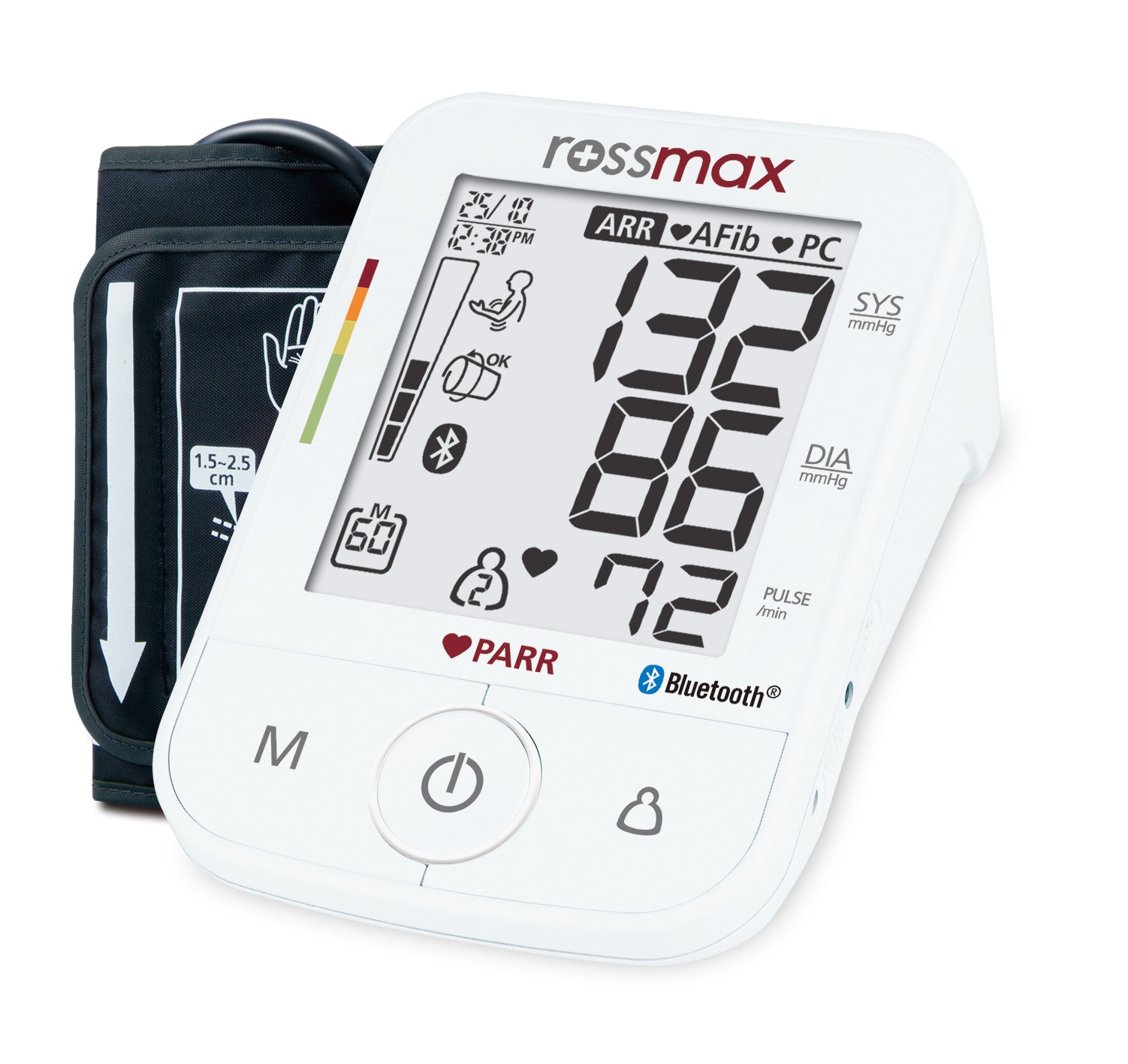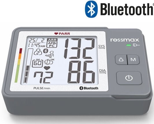 Rossmax X5 PARR on automaatne vererõhuaparaat, mis võimaldab täpset vererõhu jälgimist ning südame rütmihäirete varajast avastamist. Seade on varustatud mitmete täiustatud funktsioonidega, mis aitavad ennetada südamehaigusi ja insulti. Omadused ja eelised: PARR-tehnoloogia: tuvastab arütmiaid regulaarsete vererõhu mõõtmiste käigus. Kodade virvendusarütmia (AFib) tuvastamine: aitab avastada ebaregulaarset südamerütmi, mis võib viia verehüüvete, insuldi, südamepuudulikkuse ja muude tüsistusteni. Enneaegse kontraktsiooni (PC) tuvastamine: tuvastab südame enneaegsed kokkutõmbed, mis võivad viidata südamehäiretele. Liikumisandur: tuvastab mõõtmist segavad käeliigutused. Manseti paigalduse tuvastus: annab märku, kui mansett ei ole õigesti paigaldatud, tagades usaldusväärsed mõõtmistulemused. Hüpertensiooni riski indikaator: kuvab vererõhu taseme vastavalt Maailma Terviseorganisatsiooni (WHO) standarditele, aidates hinnata hüpertensiooni riski. Viimase kolme mõõtmise keskmine: arvutab viimase kolme mõõtmise keskmise väärtuse, pakkudes täpsemat ülevaadet vererõhu tasemest. 7-päevane AM/PM keskmine: võimaldab jälgida vererõhu muutusi hommikul ja õhtul seitsme päeva jooksul. 120 mõõtmise mälu kahele kasutajale koos kuupäeva ja kellaajaga: võimaldab salvestada kuni 120 mõõtmistulemust kahele kasutajale, hõlbustades vererõhu jälgimist pikema aja jooksul. Külalise režiim: võimaldab teistel kasutajatel mõõta vererõhku ilma andmeid salvestamata. Lateksivaba patenteeritud universaalne koonusmansett: sobib erineva suurusega õlavartele, tagades mugava ja turvalise mõõtmise. Manseti hoidik: võimaldab mansetti mugavalt hoiustada. Suur LCD-ekraan (69 x 78 mm): tagab mõõtmistulemuste selge ja lihtsa loetavuse. Ühildub Rossmax healthstyle rakendusega Bluetooth abil. Eluaegne kalibratsioon. Töötab patareidel, adapter ei ole komplektis.
