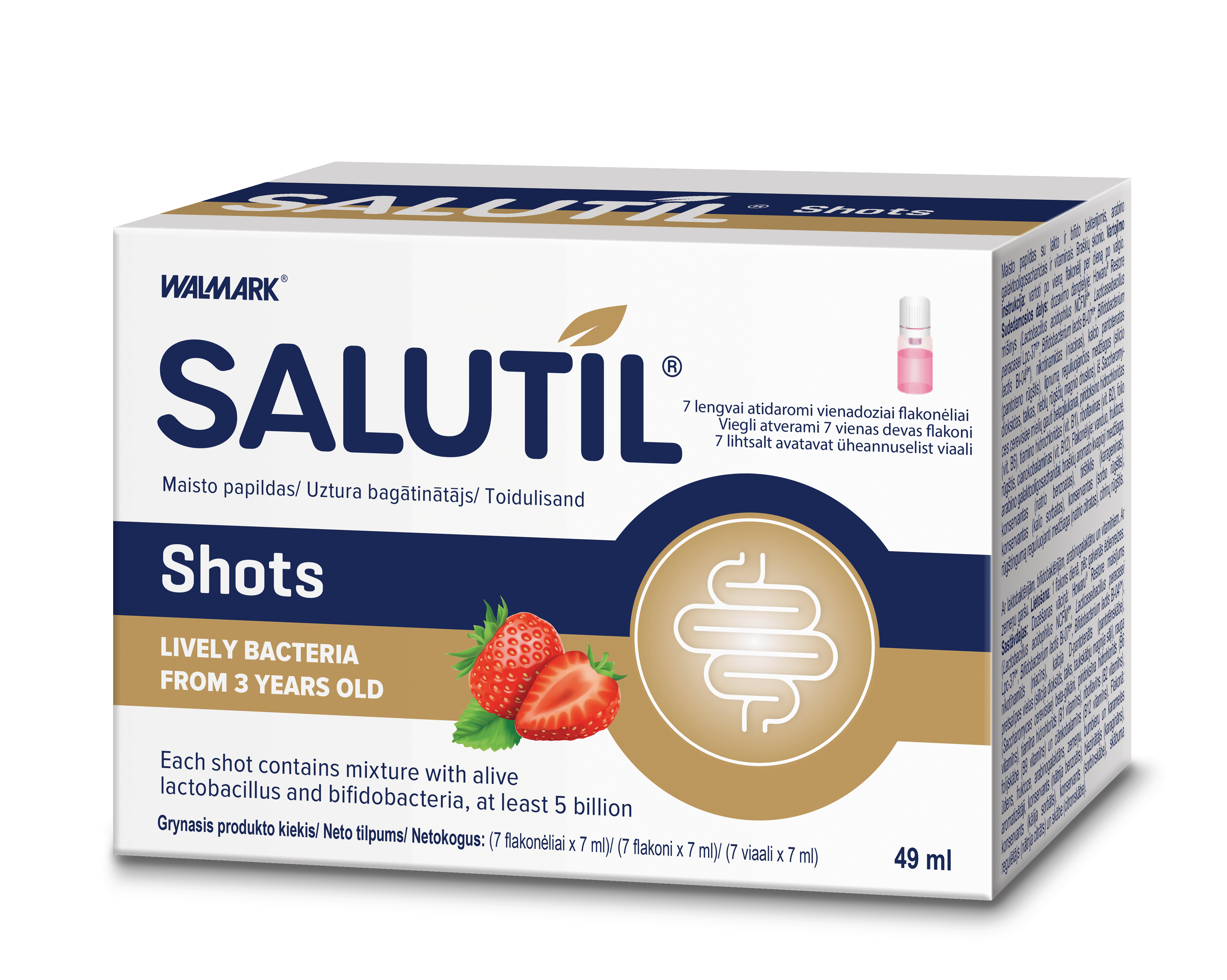 Salutil Shots 7 viaali x 7 ml Toidulisand laktobatsillide, bifidobakterite, arabinogalaktooligosahhariidide ja vitamiinidega. Maasiakamaitseline. 7 lihtsalt avatavat üheannuselist viaali