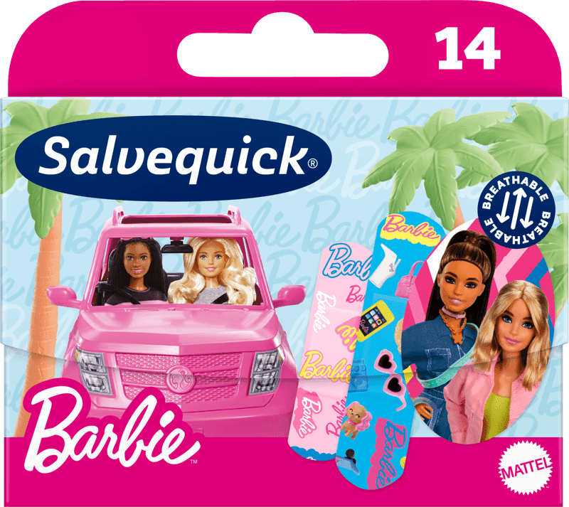 Salvequick plaastrid lastele Barbie. Kuulus Barbie tegelaskuju ehib nüüd ka Salvequicki lasteplaastreid! Aastal 1959 loodud tegelaskuju julgustab tüdrukuid avastama oma potentsiaali, toetama mitmekesisust ja enesekindlust. Väga kvaliteetsed plaastrid on suurepärane valik aktiivsetele lastele. Elastsed plaastrid on vee- ja mustusekindlad ning lasevad ka nahal hingata, tagades lastel mugava enesetunde. Plaastrid Salvequick Barbie on kolmes eri suuruses ja ovaalse kujuga, mis sobivad ka suurematele haavadele. Pakendis on 10 erineva Barbie disainiga plaastrid. Pakendis on 14 plaastrit kolmes eri suuruses:6 tk: 40 mm x 60 mm4 tk: 19 mm x 72 mm4 tk: 16 mm x 56 mm