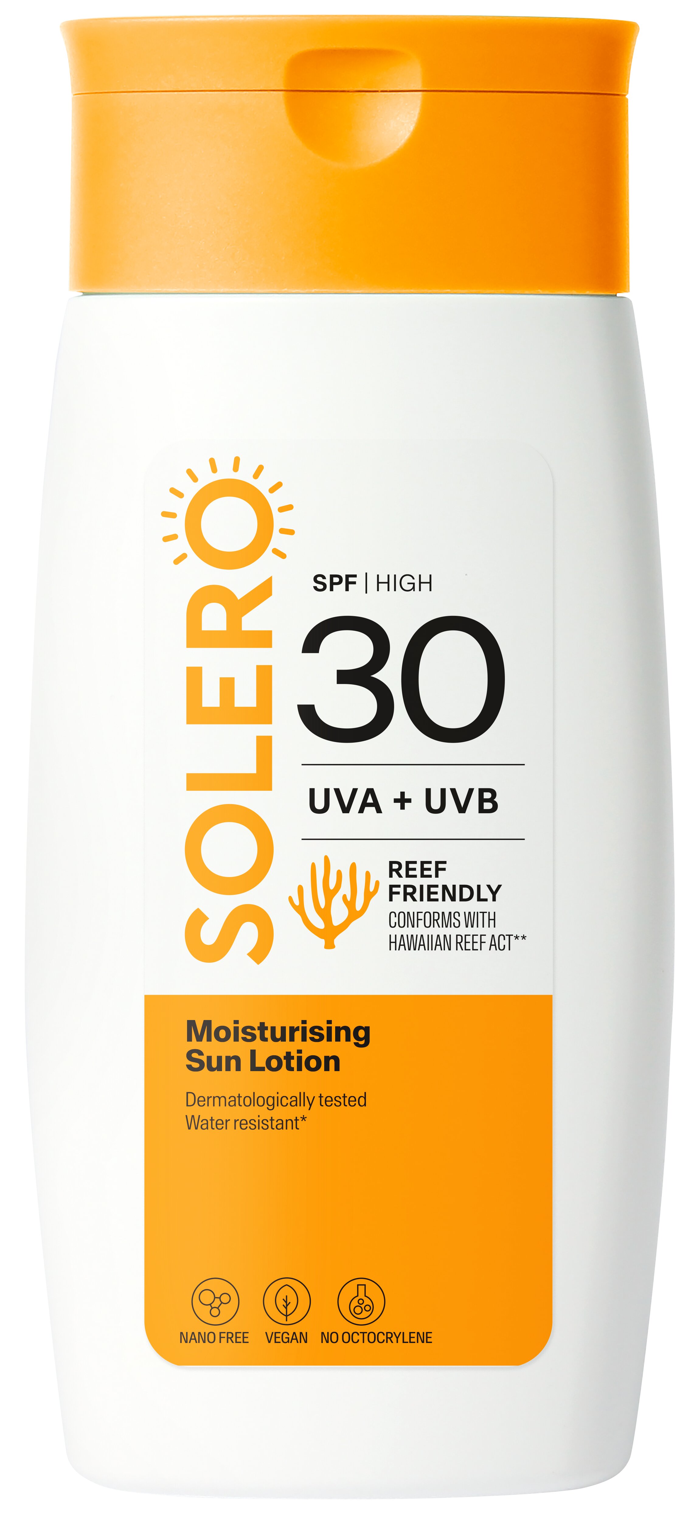 Niisutav päikesekaitselosjoon SPF 30 (tugev kaitse). Veekindel.* Korallrahusõbralik (vastab Hawaii korallrahuseadusele).** SOLERO SPF 30 Sun Lotion aitab hoida nahka niisutatud, pehme ja elastsena. Regulaarsel kasutamisel aitab see kaitsta nahka enneaegse vananemise ja päikesest põhjustatud kortsude eest. 24 h niisutav. Imendub kiiresti. Dermatoloogiliselt testitud. Hoiatused: Välispidiseks kasutamiseks. Mitte alla neelata. Hoida lastele kättesaamatus kohas. Vältida silma sattumist. Silma sattumisel loputada rohke veega. Ärge jätke alla 3-aastaseid lapsi päikese kätte. Vältige päikese käes viibimist maksimaalse kiirguse ajal ehk vahemikus 12:00 kuni 16:00. Liigne päikese käes viibimine on tervisele ohtlik. Päikese käes viibimise ajal on tungivalt soovitatav kanda mütsi, päikeseprille ja sobivat riietust. Vältige toote kokkupuudet kangastega, kuna see võib põhjustada plekke. *Pärast 40 minutit vees viibimist kaitseb nahka jätkuvalt vähemalt 50% ulatuses oma päikesekaitsefaktorist (SPF). **Ei sisalda UV-filtreid oktinoksaat ja oksübensoon.