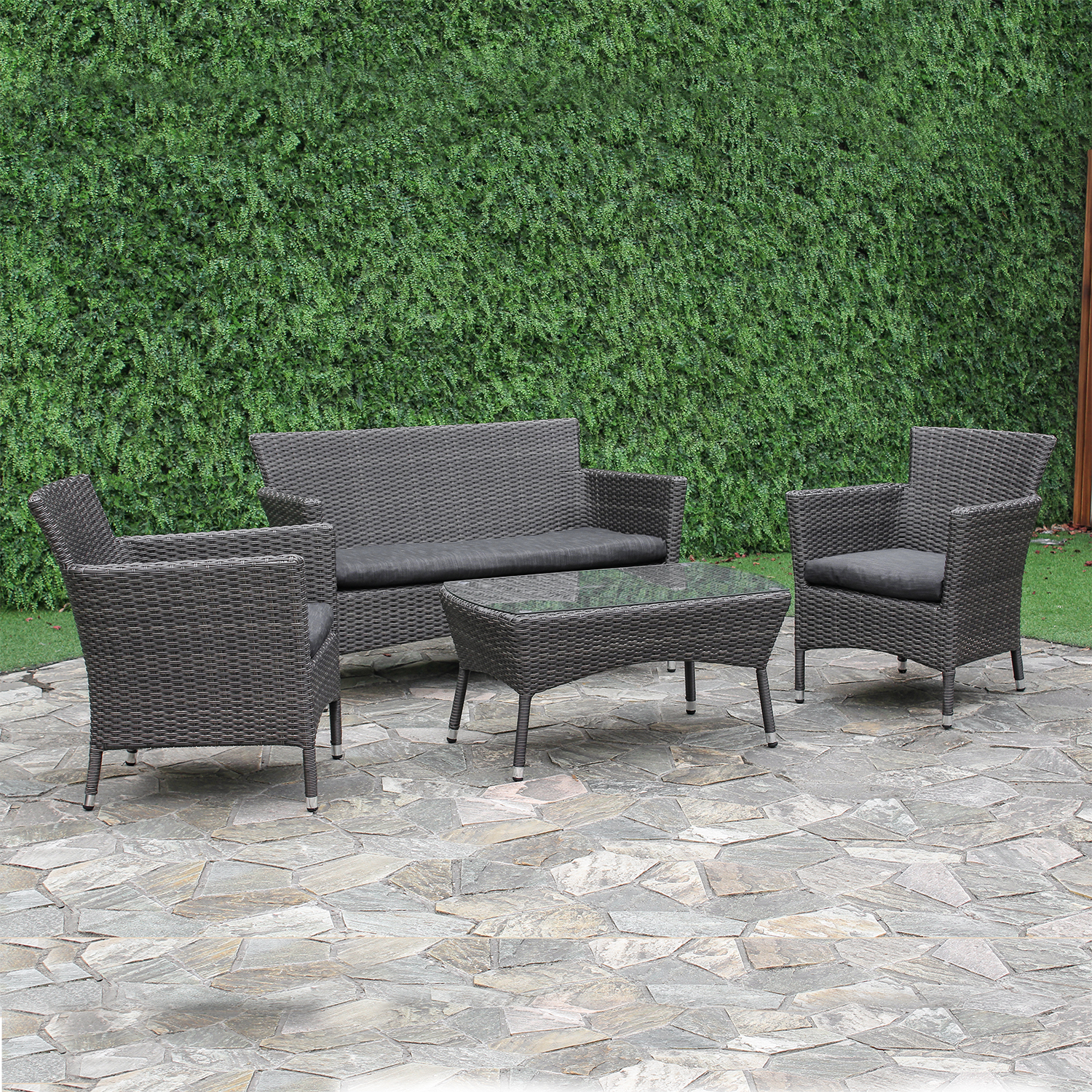 Aiamööblikomplekt WATERS laud, diivan ja 2 tooli, hall GTIN: 4741243135635 Aiamööbel <p>Aiamööblikomplekt WATERS laud, diivan ja 2 tooli. Komplekti kõigi osade raamid on valmistatud terasest ja kaetud halli plastikpunutisega. Laua mõõdud on 89x52xH40cm, lauaplaat: 5mm läbipaistev karastatud klaas. Diivani mõõdud on 129x67xH77cm. Tugitooli mõõdud 62x67xH77cm. Padjad kuuluvad komplekti. Padjakatted on valmistatud hallist olefin kangast. Toode on muutlikes ilmastikutingimustes vastupidav ja väga lihtsalt hooldatav, kaitset ilmastikutingimuste eest vajavad ainult padjad. Välitingimustes kasutatava mööbli eluea pikendamiseks soovitame kasutada välimööbli katteid. HOIUSTAMINE: suvehooaja lõppedes soovitame aiamööblit hoiustada siseruumides. Puhastage ja kuivatage mööbel enne hoiule panekut. Kasutage hoiustamiseks kuiva ning hea ventilatsiooniga ruumi.</p> | 1-3 tp | 338,00 € | Poodi | |