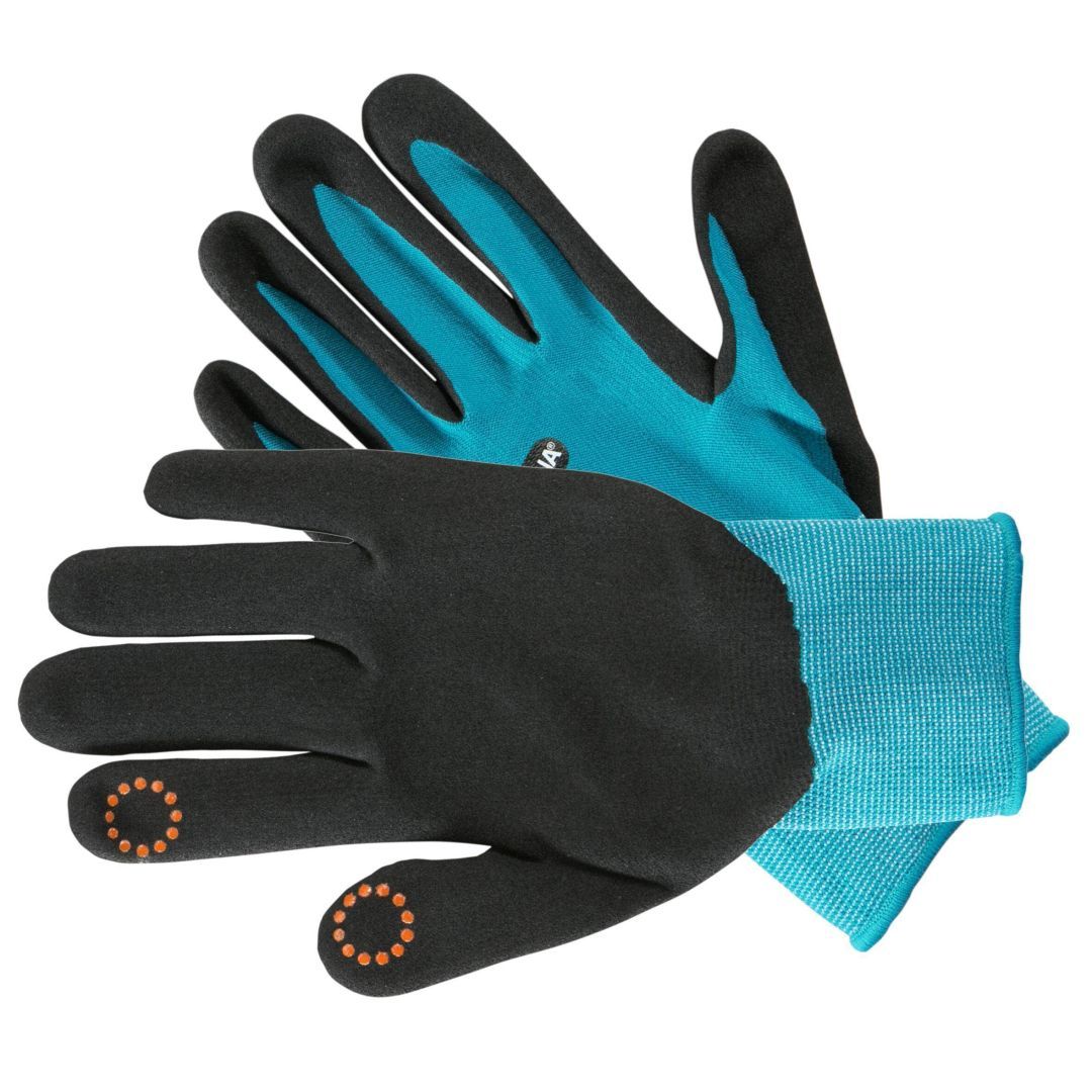 Gardena väikestele kätele mõeldud aiandus- ja hoolduskindad. Täiuslikult sobiv töökinnas on varustatud paljude uuenduslike funktsioonidega, mis muudavad kergeks aia- ja taimehooldustööd, nagu lillede ja taimede istutamine. See sobib hästi lehtede kogumiseks ja aia puhastamiseks. Peopesal olev silikoonkate annab suurepärase haarde, nii et teil on alati kõik kontrolli all, mis on eriti kasulik aiasaaduste kandmisel. Kinda põhiosa koosneb painduvast ja hingavast võrkmaterjalist. See annab suure eelise, eriti pikema kasutamise korral, sest käed ei hakka liigselt higistama. Kindad on varustatud higi imava mikrovillaga. Tänu manseti ja käe tagaküljel olevale painduvale materjalile, annab kinnas ideaalse istuvuse. Kui soovite aiatööde ajal oma nutitelefoni või tahvelarvutit kasutada, pole see probleemiks. M suuruse kinnaste jaoks on loodud nutitelefoni toega kinda nimetissõrme ja pöidla vaheline praktiline funktsioon Mobile Touch, nii et te ei peaks kinnast eemaldama. Lisaks on aia- ja hoolduskinnale omistatud Oeko-Tex® Standard 100 sertifikaat, mis tähendab, et kasutatavad tekstiilid ei sisalda kahjulikke aineid. 65% polüester, 15% nailon, 12% puuvill, 6% polüuretaan, 2% elastaan