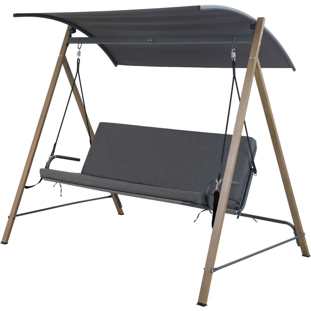 Aiakiik HERNING 3-kohaline, polükarbonaat katusega. Kiige raam on valmistatud terasest. Küljepostide naturaalse puidusüü tekstuuri meenutav pinnaviimistlus on saavutatud soojusülekande printimise meetodil. Puidu tekstuuri ülekandmiseks metalli asetatakse ülekandekile töödeldavale pinnale ja seejärel allutatakse kõrgele kuumusele. Protsessi käigus viiakse tint ülekandekilelt metalli pinnale, luues puidutaolise efekti. Sel viisil viimistletud pind on väga vastupidav ja talub hästi nii päikesekiirgust, kui kergemaid kriimustusi. Kiige istmepõhi on valmistatud ilmastikukindlast oxford kangast. Eemaldatav istmepadi on kaetud polüesterkanga. Polükarbonaat katus on vastupidav ja ilmastikukindel. Katuse kaldenurk on reguleeritav. Kiige üldmõõdud on 232x135xH173cm. Kaalupiirang 250kg. HOIUSTAMINE: suvehooaja lõppedes soovitame aiamööblit hoiustada siseruumides. Puhastage ja kuivatage mööbel enne hoiule panekut. Kasutage hoiustamiseks kuiva ning hea ventilatsiooniga ruumi.