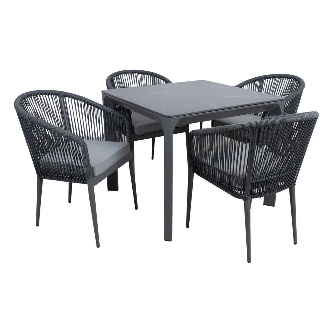 AIAMÖÖBLIKOMPLEKT ANDROS, LAUD JA 4 TOOLI GTIN: 4741617107374 Punutud mööbel Aiamööblikomplekt ANDROS laud ja 4 tooli. Laua mõõdud on 90x90xH75cm. Lauaplaat: 5mm hall, kivi meenutav karastatud klaas. Laua ja toolide jalad ja raam on valmistatud alumiiniumist ja viimistletud halli pulbervärviga. Tooli selja- ja käetoed on kaetud textilene nöörist punutisega. Istmepadjad kuuluvad komplekti. Padjakatted on valmistatud polüesterkangast. Padja paksus 5cm. Istmepõhi on toestatud on alumiiniumliistudega. Tooli mõõdud on 56x57xH85cm, istmekõrgus 44cm. Kaalupiirang 100kg. Toolid on virnastatavad ning nende hoiustamine on lihtne ja ruumi säästev. Toode on muutlikes ilmastikutingimustes vastupidav ja lihtsalt hooldatav. Välitingimustes kasutatava mööbli eluea pikendamiseks soovitame kasutada välimööbli katteid. HOIUSTAMINE: suvehooaja lõppedes soovitame aiamööblit hoiustada siseruumides. Puhastage ja kuivatage mööbel enne hoiule panekut. Kasutage hoiustamiseks kuiva ning hea ventilatsiooniga ruumi. | 14 tp | 639,00 € | Poodi | |