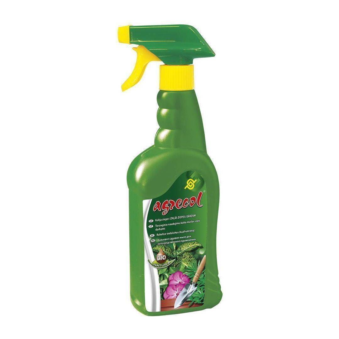Agrecol kasutusvalmis kaaliumseebi lahus on valmistatud taimsetest looduslikelt puhastest õlidest. Seda toodet on eriti soovitatav kasutada majapidamises, aedades ja põllumajapidamises, mis eelistavad naturaalseid taimekasvatuse ja hoolduse meetodeid. <br /><br />KASUTAMINE: Kasutada poti-, rõdutaimede, aias, kasvuhoones, kiletunnelites, püsilavades kasvavate taimede kasvatamisel. Kasutada aiatööriistade, mahutite, kastide, lillepottide jms pesemiseks. Kaaliumseebi lahusega võib pesta ka juhuslikult määrdunud taimede pinda. Kaaliumseebi kasutamine ei avalda taimedele, ka naturaalsete meetoditega kasvatavatele taimedele, kahjulikku mõju. Enne kasutamist loksutada. <br />SÄILITAMINE JA OHUTUSMEETMED: <br />• Hoida lastele kättesaamatus kohas.<br />• Hoida pakend kuivas ja varjulises kohas. <br />• Hoida ainult originaalpakendis, temperatuuril alates 0 C kuni 25 C. <br />• Vältida silma sattumist. Silma sattumisel loputada kohe rohke veega ja pöörduda arsti poole. <br />• Mitte alla neelata. Kemikaali allaneelamise korral pöörduda viivitamatult arsti poole ja näidata talle pakendit või etiketti.