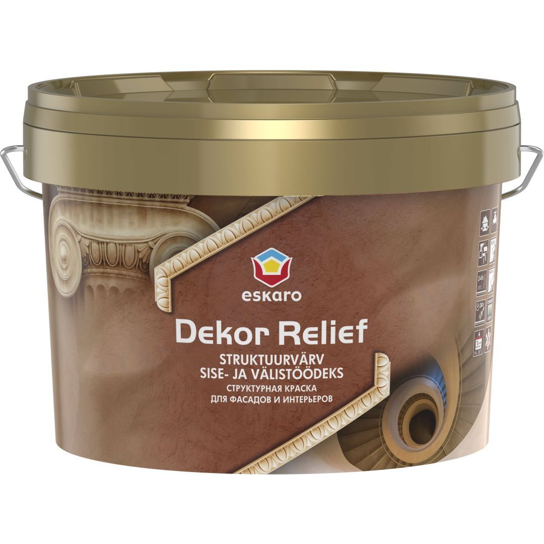 Eskaro Dekor Relief vesialuseline, matt struktuurne akrülaatvärv sise- ja välistöödeks. Sobib siseruumide (seinad ja laed) dekoratiivseks viimistlemiseks ja reljeefse pinna loomi-seks mineraalsetele fassaadidel. Ei sobi eelnevalt silikaat- või lubjasegudega krohvitud või värvitud pindade katmiseks. Värv on toonitav. Kogus 2,7 l.