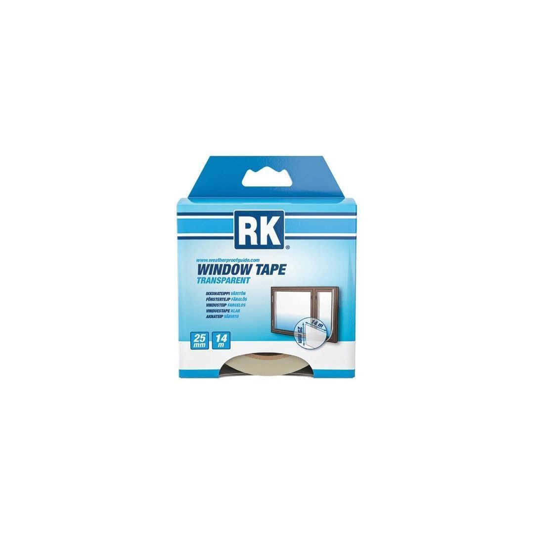 RK läbipaistev aknateip. Hoiab ära tolmu levimise väljastpoolt. Äärmiselt vastupidav teip sise- ja välistingimustes kasutamiseks. Piiratud nakkuvus õliga töödeldud puidul. Vältige paigaldamist temperatuuril alla +10°C. Mõõdud: 25 mm x 14 m.