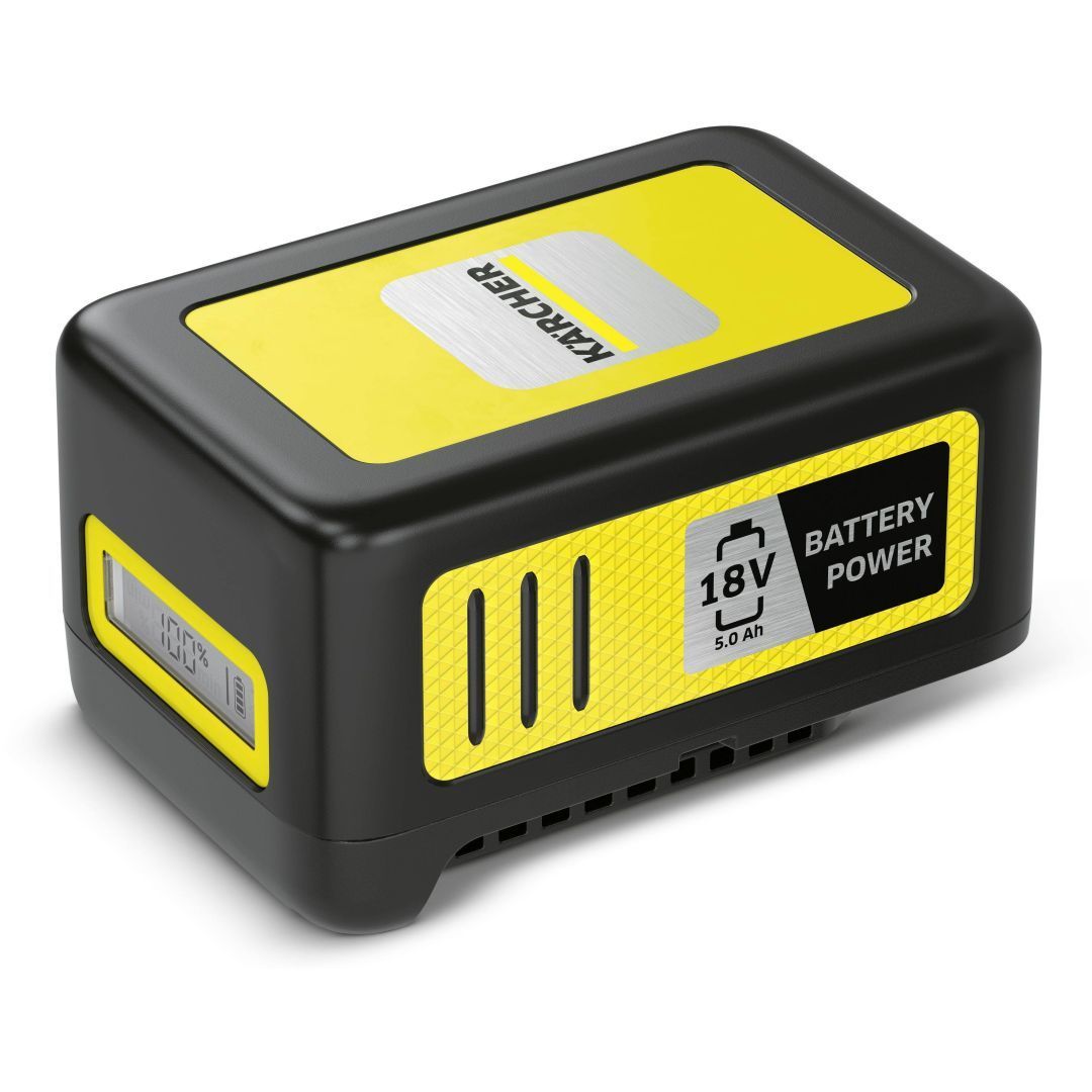 Kärcheri uuendusliku reaalaja tehnoloogiaga 18 V/5.0 Ah Battery Power vahetatav aku näitab LCD ekraanil akutaset. Sobib kasutamiseks kõikidel 18 V Battery Power akuplatvormi seadmetel.