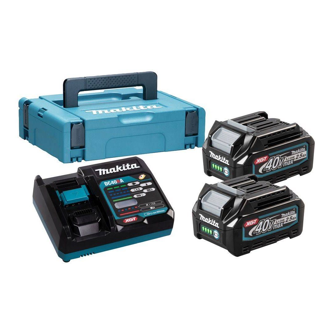 Makita praktiline powerpack XGT® 40 V max tööriistadele. Makpac kast sisaldab kahte 2,5 Ah Li-ion akut ja kiirlaadijat. Aku on varustatud laadimistaseme näidikuga. 2,5 Ah aku laadimisaeg 28 minutit.