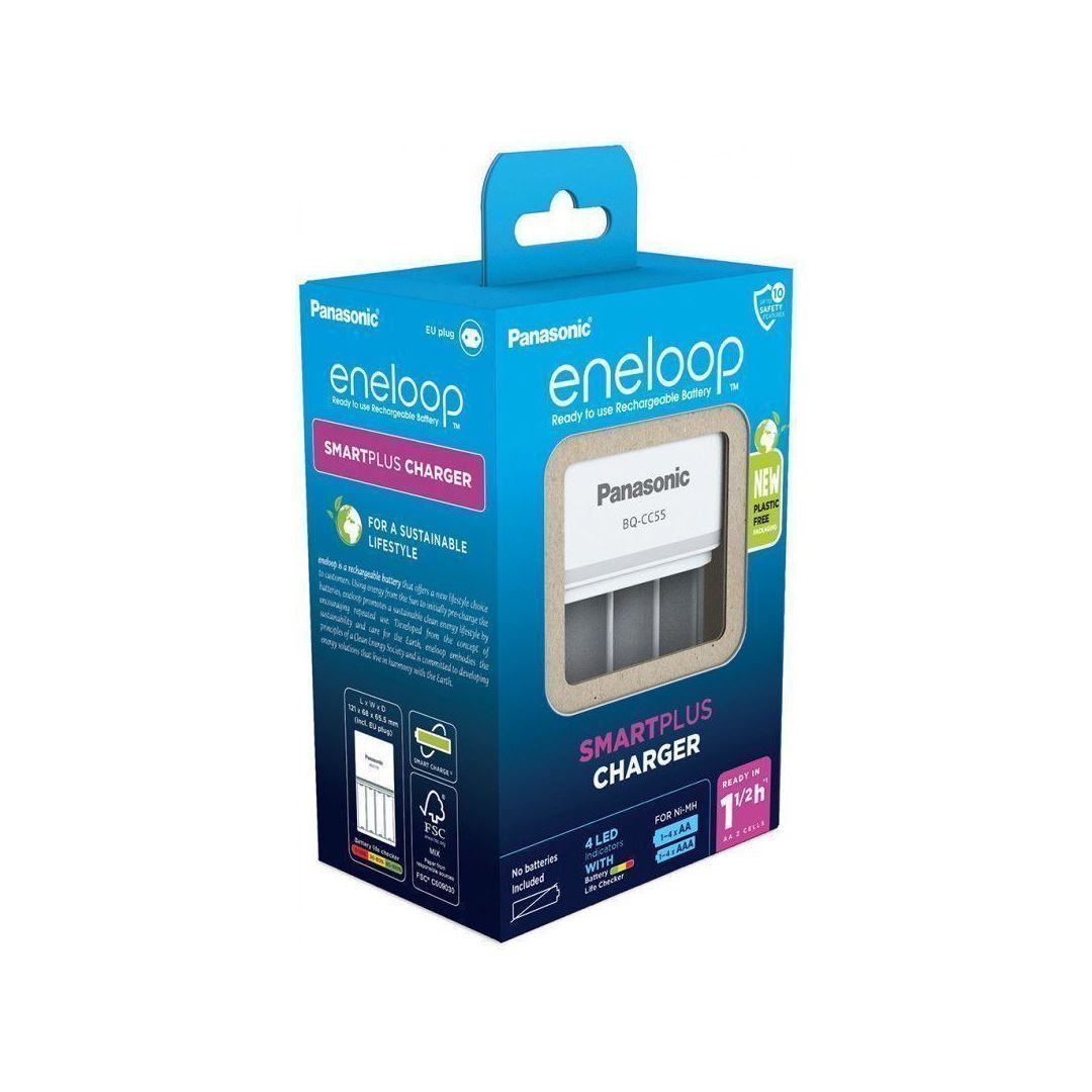 Panasonic eneloop BQ-CC55 laadija laeb korraga 1-4, AA ja/või AAA akupatareid. Smart Charge tehnoloogia mõõdab akupatarei pinget ja lõpetab laadimise vahetult enne ülelaadmist, tagades akudele pikema eluea. LED-indikaator näitab erinevate värvidega akupatarei täituvust. BQ-CC55 Sobib 550–2550 mAh AA & AAA NiMH akude laadimiseks. Laadijat saab kasutada kõikjal maailmas (100–240 V sisendpinge).