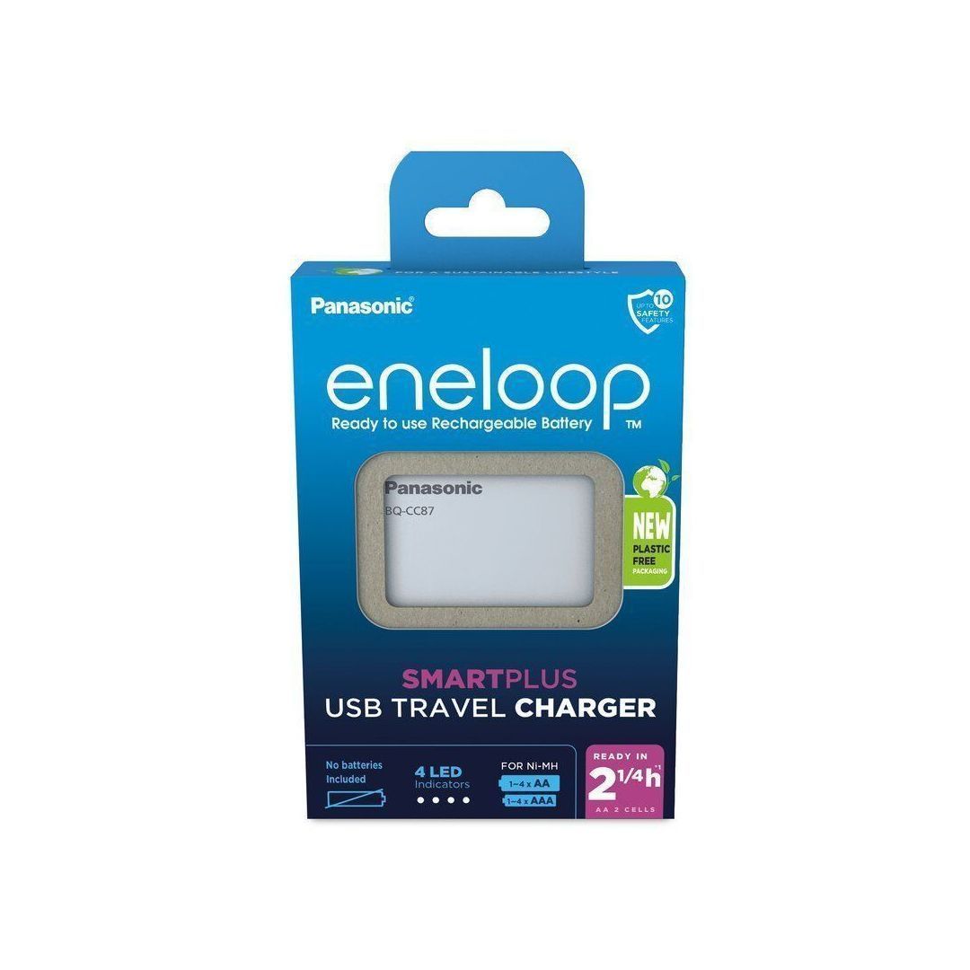 Panasonic eneloop CC87 USB laadijaga saab laadida 1–4 AA ja/või AAA akupatareid. Sõltuvalt laetavatest akupatareidest, kulub akupatareide laadimiseks 0,75-4 tundi. Smart Charge tehnoloogia mõõdab akupatarei pinget ja lõpetab laadimise vahetult enne ülelaadmist, tagades akudele pikema eluea. LED-indikaator näitab erinevate värvidega akupatarei täituvust. Eeldusel, et laadijas on täislaetud akupatareid, saab laadijat kasutada akupangana, näiteks nutiseadmete laadimiseks. Laadijaga on kaasas USB - microUSB kaabel.