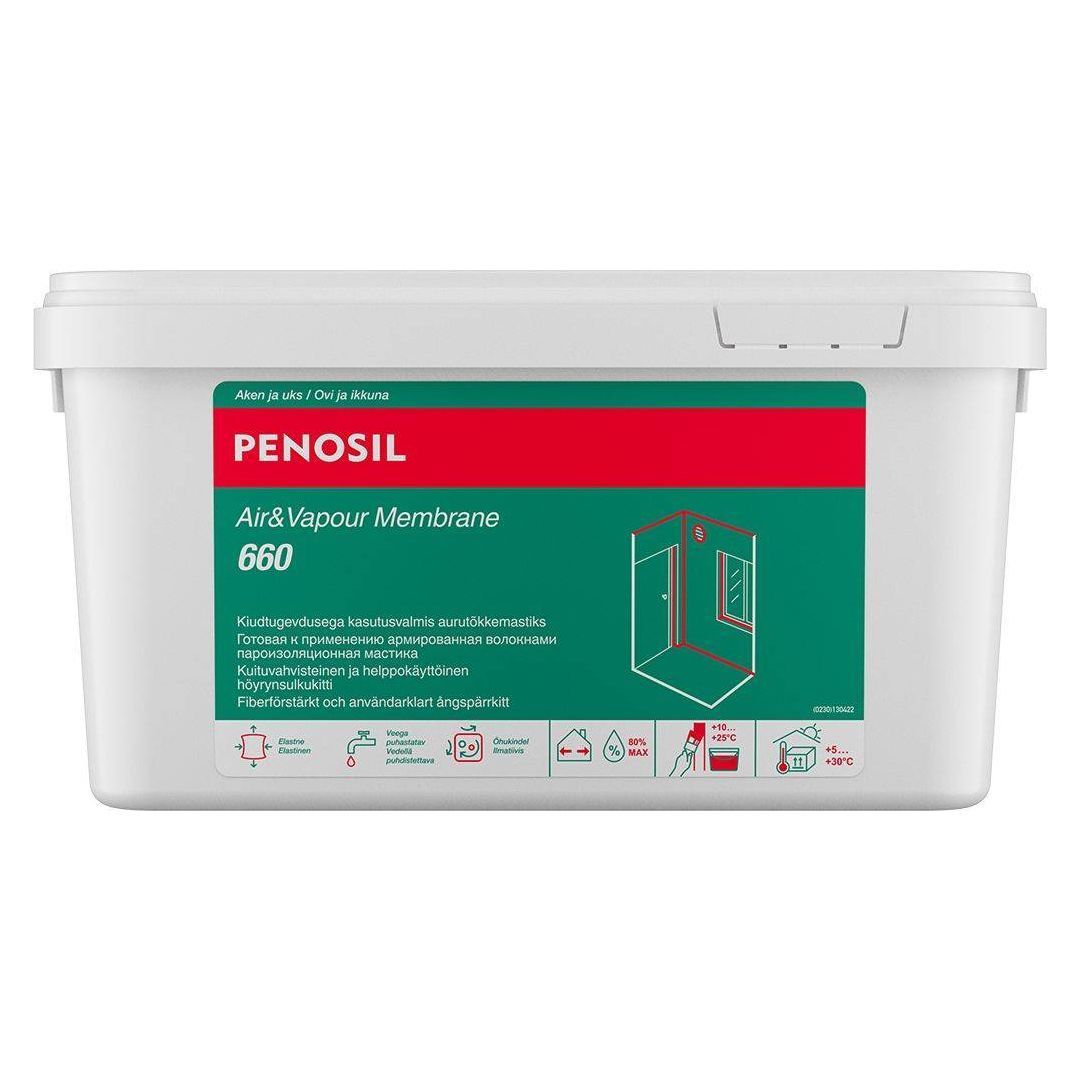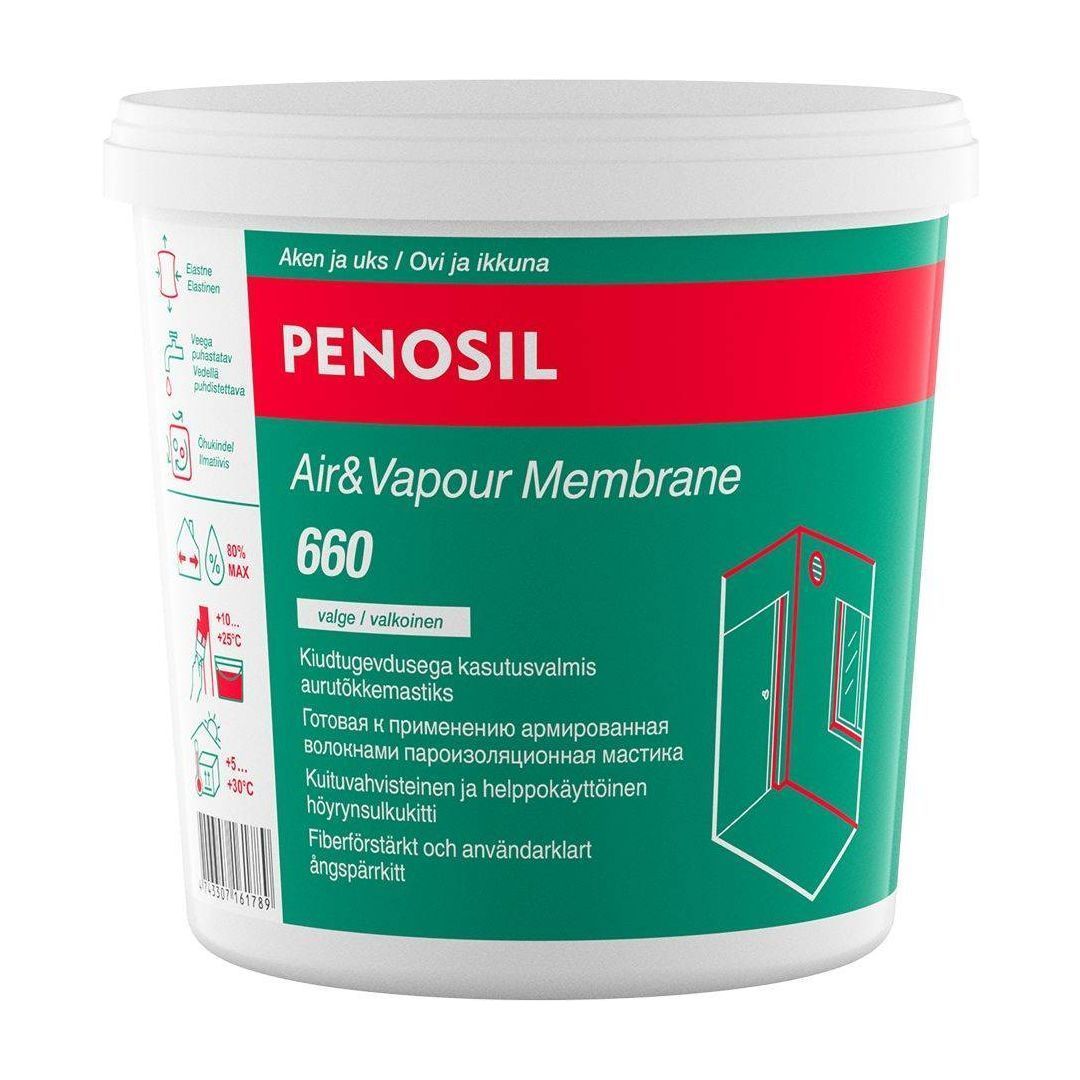 Penosil Air&Vapour Membrane 660 on kiudtugevdusega kasutusvalmis aurutõkkemastiks akna- ja uksevuukide tihendamiseks seestpoolt. Mastiks on vesialuseline, ei eralda kuivamisel lõhna ega kahjulikke ühendeid. Kuivana moodustab elastse, õhutiheda ja veeaurukindla kihi. Sobib suurepäraselt renoveerimistöödeks ja poorsete pindade tihendamiseks. Õhu- ja aurukindel. Kiudtugevdusega. Lihtne peale kanda. Ideaalne poorsetele, karedatele ja ebatasastele pindadele. Püsivalt elastne. Hallitus- ja UV kindel. Suurepärane nake paljude materjalidega.<br /><br><br /><iframe width="560" height="315" src="https://www.youtube.com/embed/zEO3x7ZL5o4?si=UZshzcdSvPgY5cIC" title="YouTube video player" frameborder="0" allow="accelerometer; autoplay; clipboard-write; encrypted-media; gyroscope; picture-in-picture; web-share" allowfullscreen></iframe>