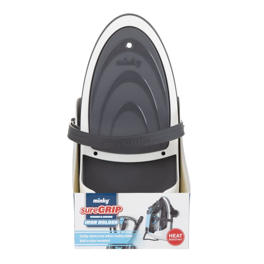 Minky Sure Grip aurutriikraua kuumuskindel hoidik, mis sobib kõigile standardsetele auru triikraudadele. Sellel on reguleeritav silikoonist rihm, mis tagab turvalise ja kindla hoiustamise. Hoidikut on võimalik paigaldada nii seinale kui ka uksele. Kompaktne ja ruumisäästlik disain.
