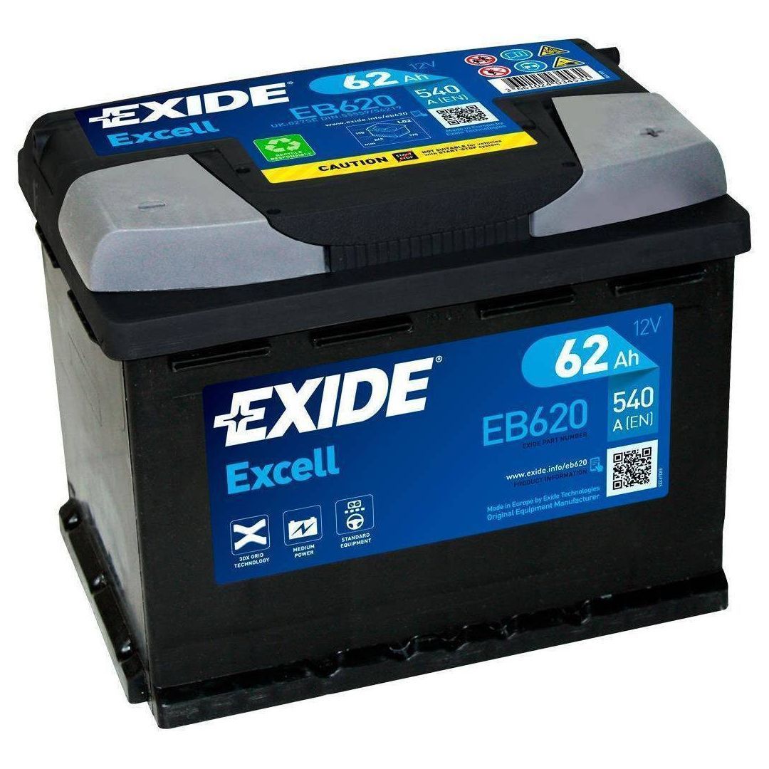 Exide käivitusaku Excell kaasaegsele autole. Mahutuvus: 62 Ah. Käivitusvool: 540 A. Tavaakust kuni +15% kõrgem käivitusvool. Hooldevaba, eriti väike veekulu ja isetühjenemine. Tsentraalne gaaside eraldussüsteem, mis vähendab aku plahvatusohtu. Talub hästi korduvaid külmkäivitamisi ning elektritarbijatega koormamist. Sobib väikese ja keskmise töömahuga bensiinimootoriga autodele. Mõõtmed on 24,2 x 17,5 x 19 cm.