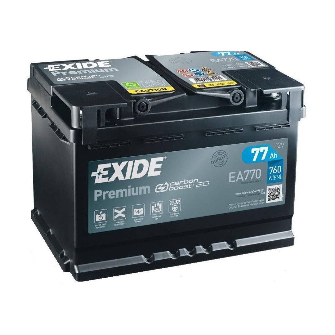 Exide käivitusaku Premium. Mahutuvus: 77 Ah. Käivitusvool: 760 A. Ideaalne aku paljude elektriliste lisaseadmetega autole. Carbon Boost tehnoloogia pakub kuni 50% paremat vastuvõtlikkust laadimisele. Eriti kõrge käivitusvool, võrreldes tavaakuga kuni 30%. Talub hästi sügavtühjendamist ning laadimis- ja tühjenemistsükleid. Eriti pikk kasutusiga. Ideaalne külmades ilmastikutingimustes ja ohtral linnasõidul. Tsentraalne gaaside eraldussüsteem ja turvalisust lisav korpuse kaas. Minimaalne elektrolüüdi väljavalgumine isegi siis, kui aku on kaldu. 100% hooldevaba, eriti väike veekulu ja isetühjenemine. Vastab originaalosa kvaliteedi nõuetele. Eriti sobilik diiselmootoriga ja suure töömahuga bensiinimootoriga autodele. Mõõtmed on 27,8 x 17,5 x 19 cm.