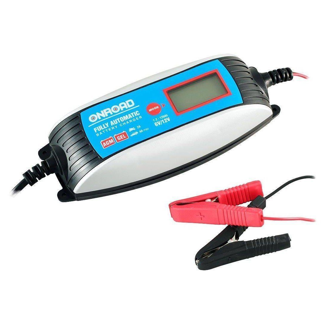 Onroad täisautomaatne akulaadija. Laadimisvool kuni 4 A, LCD ekraan laadimisandmetega, 7 laadimisastet. Toitevool: AC 230 V 50 Hz, 0.9 A. Väljundpinge: 6 V DC, 2 A / 12 V DC, 4 A. Sobib kõikidele aku tüüpidele (1,2 - 120 Ah).