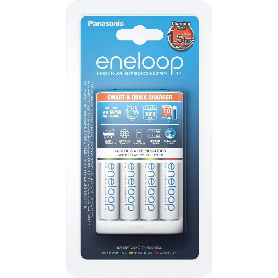 Panasonic BQ-CC55 laadija laeb nii AA kui AAA elemente. Laadijat saab kasutada kõikjal maailmas (100–240V sisendpinge) ning sel on ka individuaalne laadimise kontroll – delta V. Tänu erivärvilistele LED indikaatoritele näed, kui palju on akud laetud. Akulaadija sobiv mahtuvuson 800–2600 mAh.<br />Laeb korraga AA 1 kuni 4 akut, AAA 1 kuni 4 akut. Akulaadija on varustatud automaatse väljalülitusega, kui aku on täis (delta V). Laadijal on mittelaetava patarei tuvastus, ülekuumenemise kaitse. Neli iseseisvat laadimiskanalit koos LED indikaatoritega. Laadimisaeg on 1,5–3 tundi, sõltuvalt elemendi tüübist ja hulgast.<br />Sobib erinevate tootjate NiMH akudele. Komplektis neli eneloop AA 1900 mAh NiMH akut.