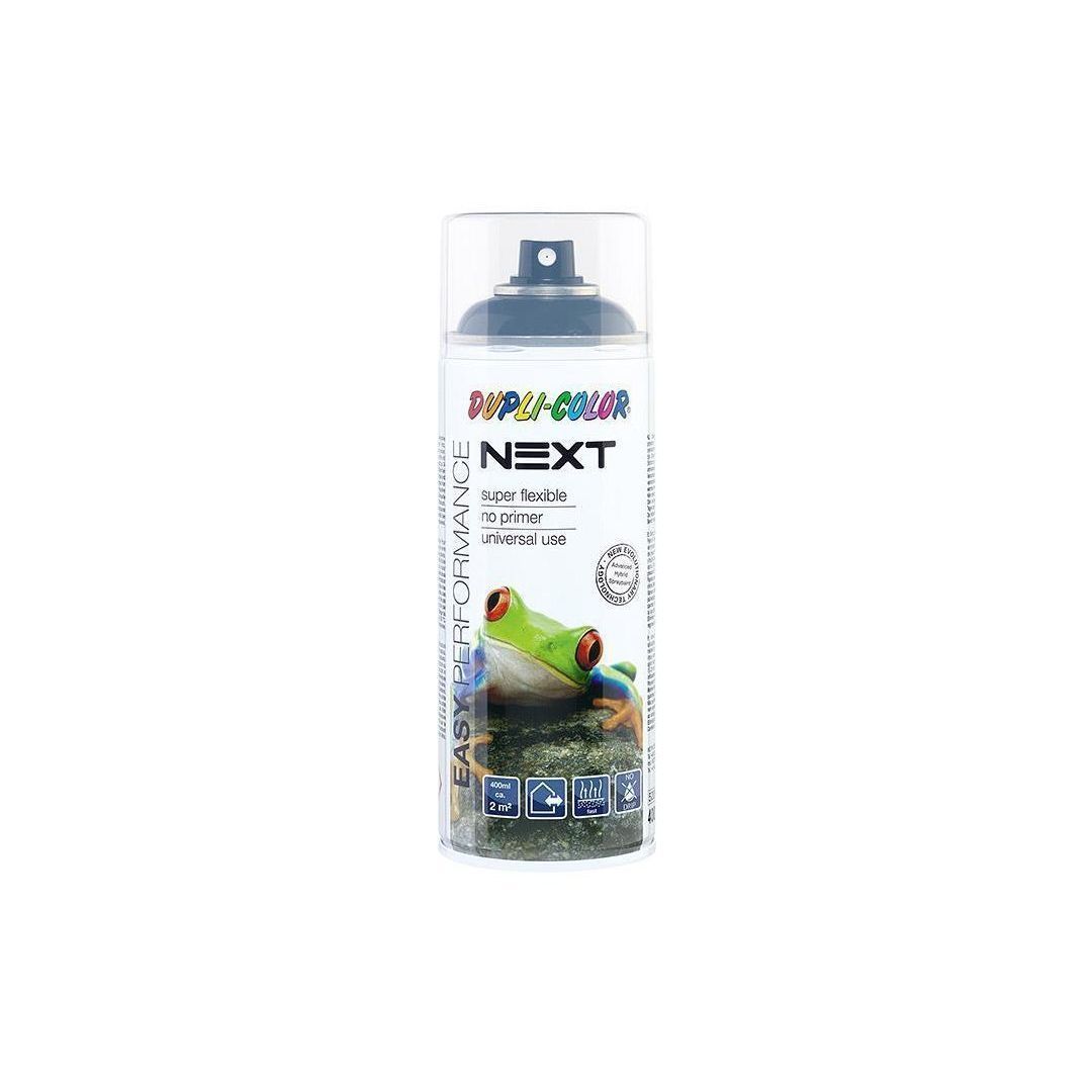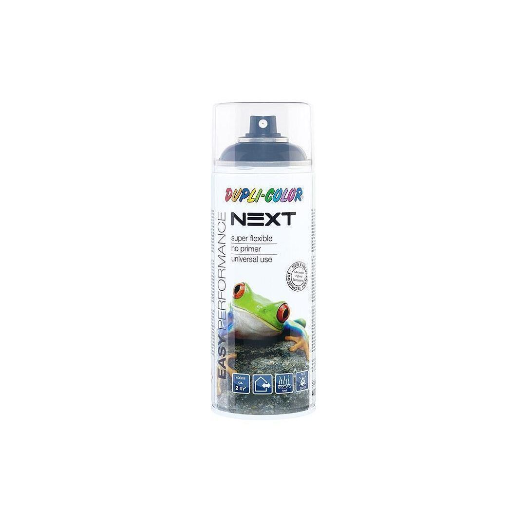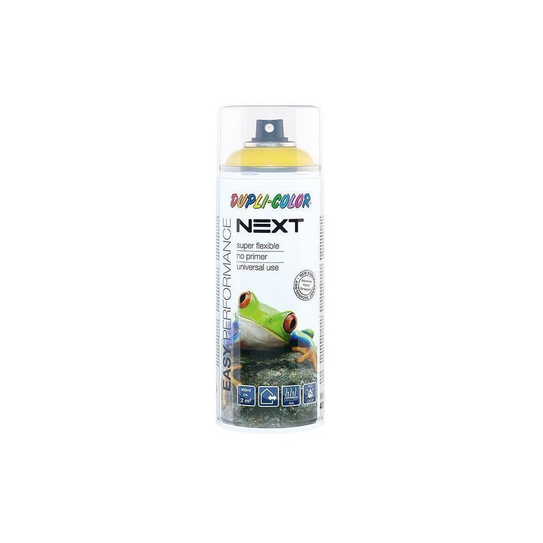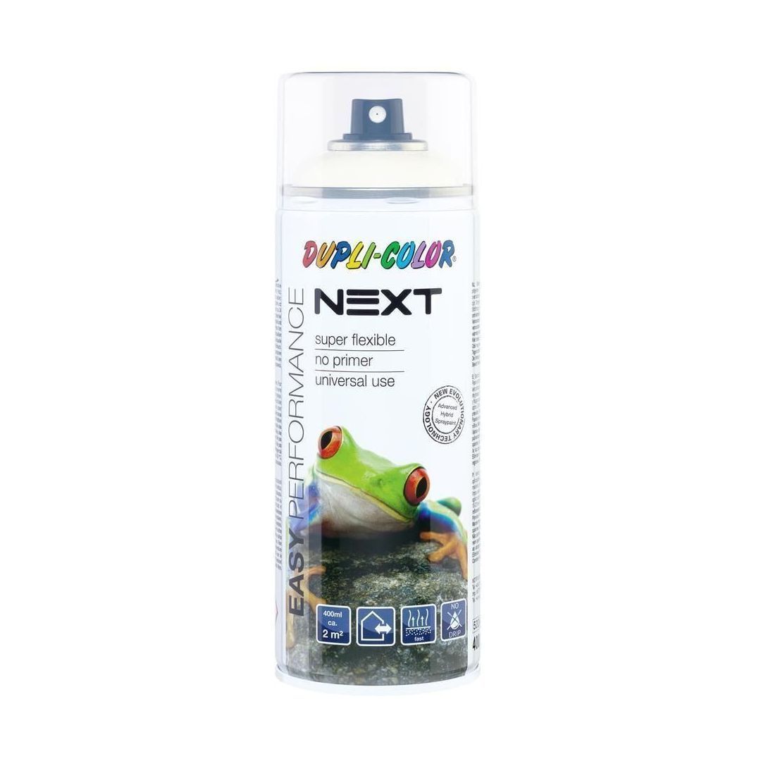 Dupli Color Next läikiv aerosoolvärv on valmistatud alkoholi baasil. Meeldiv keemilise lisandita lõhn. Lihtne kasutada - universaalne sobivus teiste värvidega (akrüül ja alküüd). Täiuslik nakkumine paljudel pindadel ilma krundita. Sobib ka kandmiseks otse vahtpolüstüroolile. Ühtlane pihustamine ja elegantne värvi tasandumine. Kiire kuivamine ja täiuslik katvus. Sobib kasutamiseks sise- ja välistingimustes. Painduv värvikiht, millel on hea kriimustuskindlus. Biolagunev lahusti kasutajasõbralikuks kasutamiseks. Katvus: 400 ml umbes 2 m². Kuivamisaeg 20°C juures: Tolmukuiv 10 - 20 min. Puutekuiv 45 min. Ülevärvitav umbes 2 h. Kuivamisaeg sõltub temp. ja õhuniiskusest. Töötemperatuur +10 -25°C. Alküüdvärvile kantuna, kuivab umbes 1 nädal.