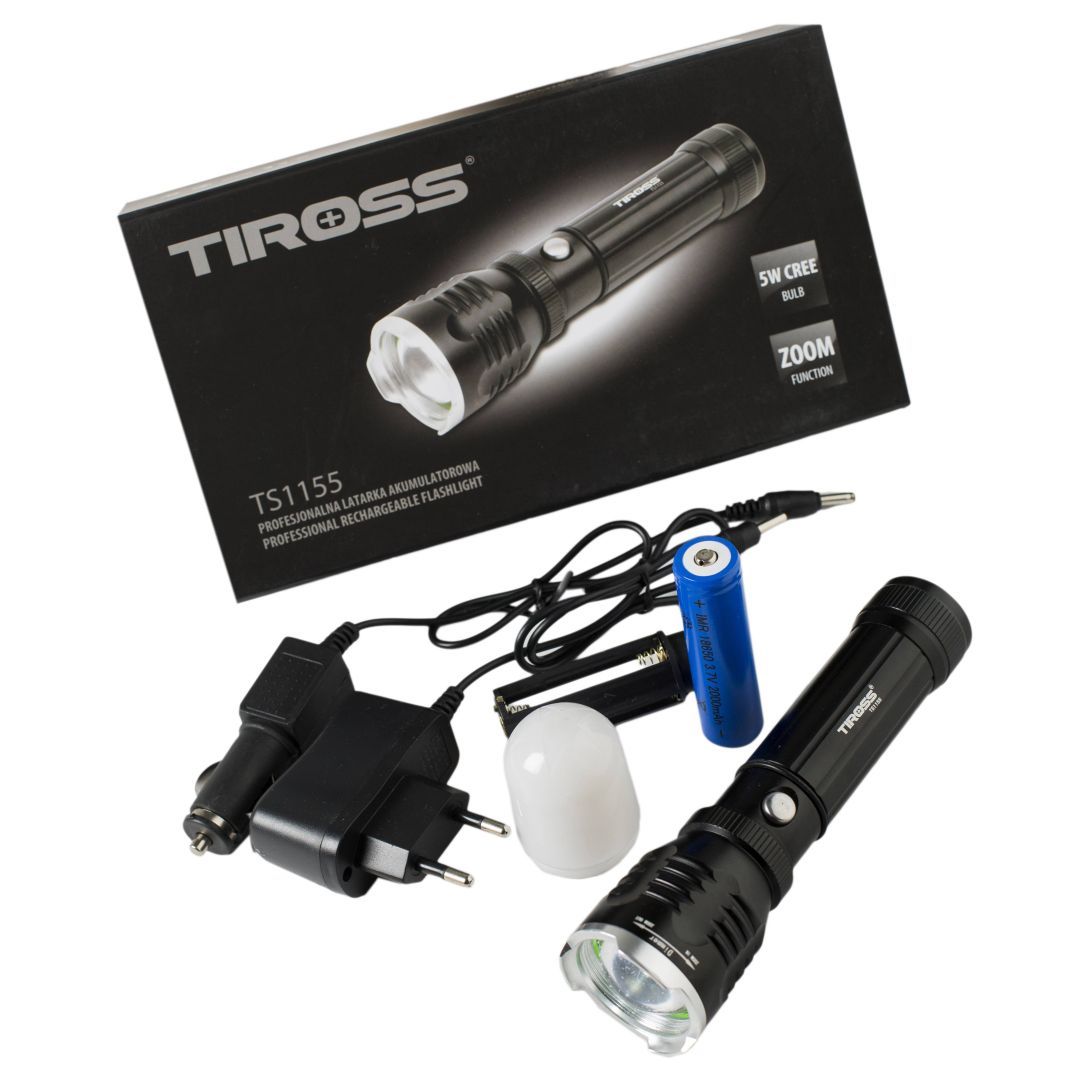 TIROSS CREE TS-1155 on 5W laetav LED akutaskulamp, millel on Zoom funktsioon ning veekindel korpus IPX4. <br /><br />Taskulambil on 3,7V 2000mAh aku, kuid seda on võimalik kasutada ka patareidega. Komplektis on kaasas toa- ja autolaadija.