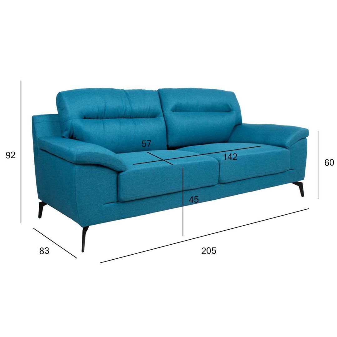 Diivan ENZO 3-kohaline, meresinine. Diivani karkass on valmistatud täispuidust ja vineerist. Polsterduseks on kasutaud polüuretaanvahtu tihedusega 25kg/m³. Istme sees on pocket vedruplokk. Lahtised seljatoepadjad kinnituvad seljatoe külge tõmbluku ja takjaribaga. Padjad on täidetud polüesterkiuga. Diivani kattematerjal: 100% polüesterkangagas. Diivani üldmõõdud on 205x83xH92cm. Istme laius 142cm, istme sügavus 57cm, istme kõrgus 45cm. Käetoe kõrgus maast 60cm, käetoe laius 32cm. Diivanil on tumedad metallist jalad H14cm.