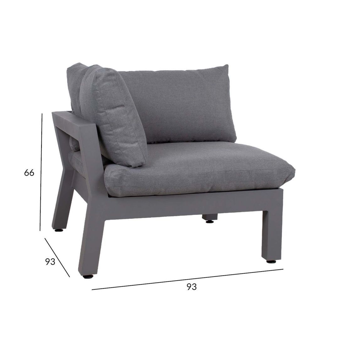 Diivani nurgamoodul FLUFFY 93x93xH66cm, hall. Mooduldiivan on suurepärane võimalus luua sobiva kuju ja suurusega istumiskoht, mida on lihtne muuta ja ümber paigutada. Tooli raam on valmistatud alumiiniumist ja viimistletud halli pulbervärviga. Istmepõhjas on laiad põimitud rihmad, mida katab 3cm poroloonmatt. Paksud ja pehmed padjad ning elastne istmepõhi tagavad suurepärase istumismugavuse. Istme kõrgus raami ääreni on 35cm, koos padjaga 51cm. Istmepadja mõõdud on 87x87xH16cm, seljatoepatjade mõõdud on 87x43x18cm, 72x43x16cm. Padjakatted on valmistatud hallist polüesterkangast. Padjakatted on eemaldatavad ja pestavad. Toode on muutlikes ilmastikutingimustes hästi vastupidav ja lihtsalt hooldatav. Kaitset ilmastikuolude eest vajavad ainult padjad. Hea lahendus patjade igapäevaseks hoiustamiseks ja kuivana hoidmiseks on padjakast. Välitingimustes kasutatava mööbli eluea pikendamiseks soovitame kasutada välimööbli katteid. HOIUSTAMINE: suvehooaja lõppedes soovitame aiamööblit hoiustada siseruumides. Puhastage ja kuivatage mööbel enne hoiule panekut. Kasutage hoiustamiseks kuiva ning hea ventilatsiooniga ruumi.