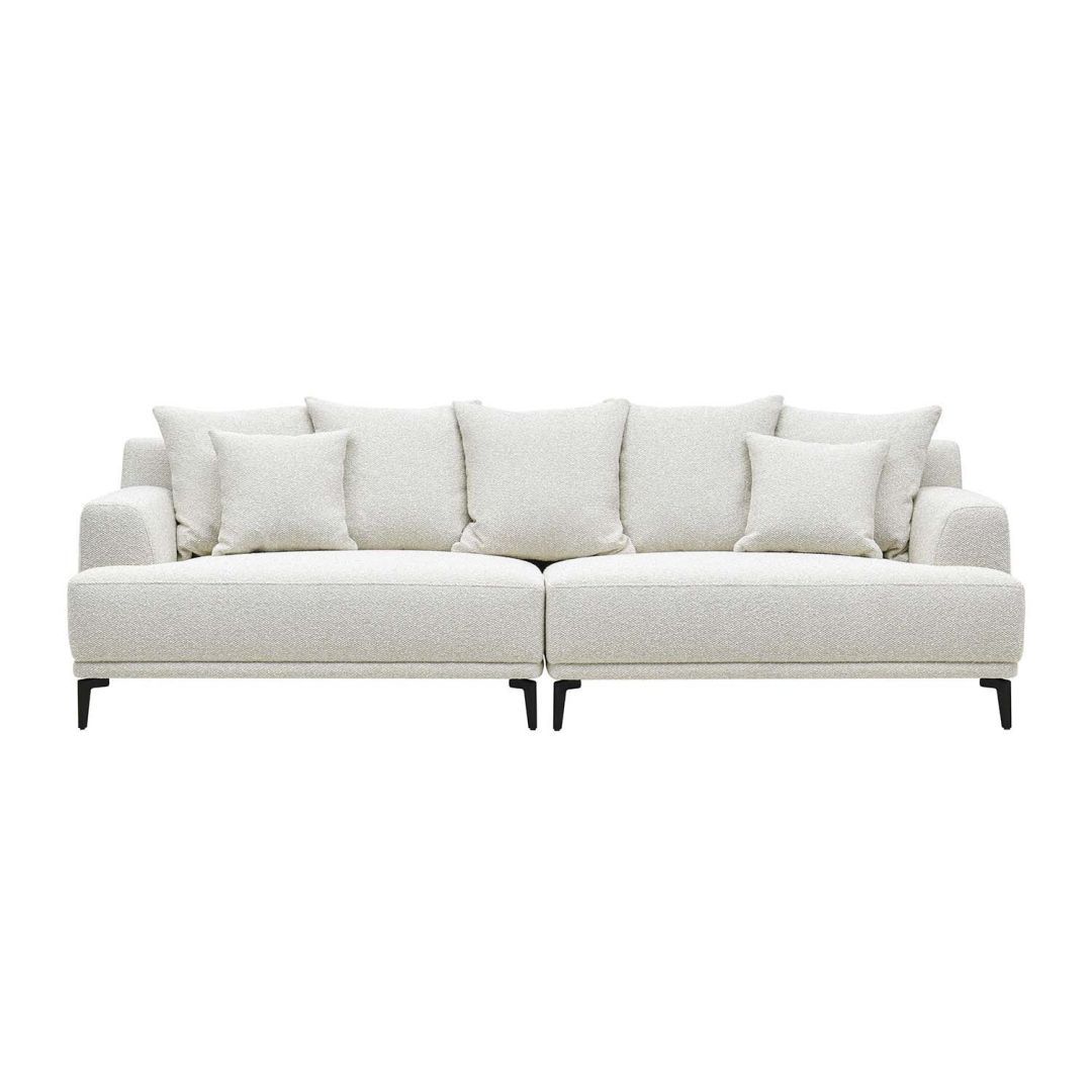Diivan MAGNOLIA 4-kohaline, helebeež. Luksuslik, efektse kangaga kaetud hele diivan on tõeline pilgupüüdja. Lahtised seljatoepadjad mõjuvad kutsuvalt ja pakuvad suurepärast mugavust. Diivani karkass on valmistatud männipuidust. Iste on polsterdatud kvaliteetse polüuretaanvahuga. Istmepõhjale annavad vajaliku toe ja elastsuse kvaliteetsed terasest sik-sak vedrud. Lahtised seljatoepadjad on täidetud mahulise polüesterkiuga. Seljatoepatjade mõõdud on 54x54cm / 5tk ja 42x42cm / 2tk. Diivan on üleni kaetud vastupidava, jämedakoelise struktuuriga polüesterkangaga. Diivani üldmõõdud on 264x96xH76cm. Istme laius 219cm, istme sügavus 60/75cm, istme kõrgus 45cm. Käetoe kõrgus maast 63cm, käetoe laius 18cm. Diivanil on mustad metallist jalad H15cm.