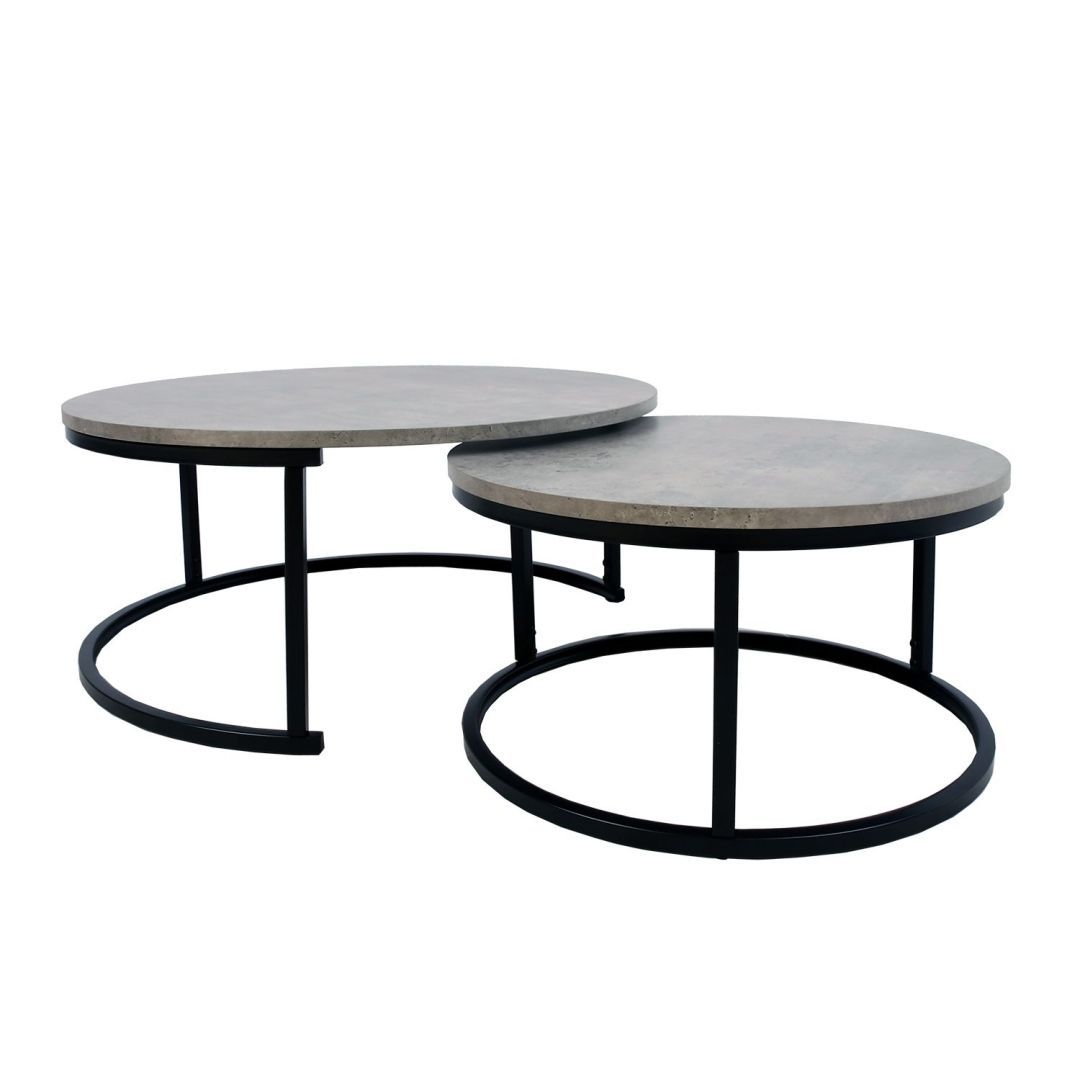 Diivanilaud BRITU 2tk komplektis, hall. Lauaplaat on betooni meenutava dekooriga ning valmistatud 18mm paksusest MDF plaadist. Laua raam ja jalad on valmistatud metallist ning kaetud musta pulbervärviga. Laudade mõõdud on D80xH35cm, D60xH32cm.
