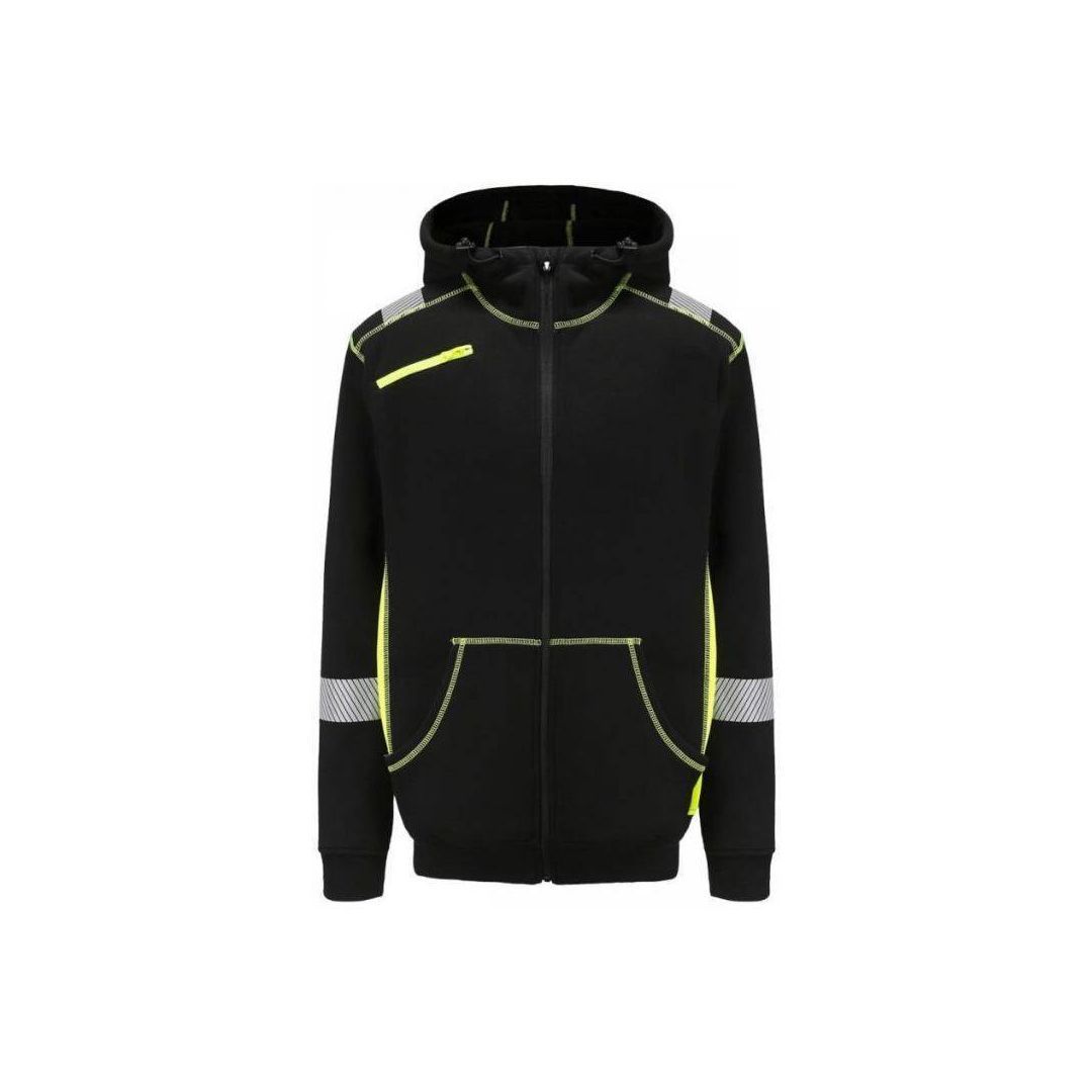 Pesso must kapuutsiga dressipluus Jersey_HV on mugav ja soe. Sellel on kollased kõrgnähtavad detailid ja 5 cm laiused kuumpressitud helkurid. Dressipluusil on kõrge krae, reguleeritav kapuuts ning alaservas ja varrukate otstes on elastne soonik. Lisaks on veel 2 küljetaskut ja lukuga väline rinnatasku. Material: 65% puuvill, 35% polüester, seest harjatud, 300 g/m².