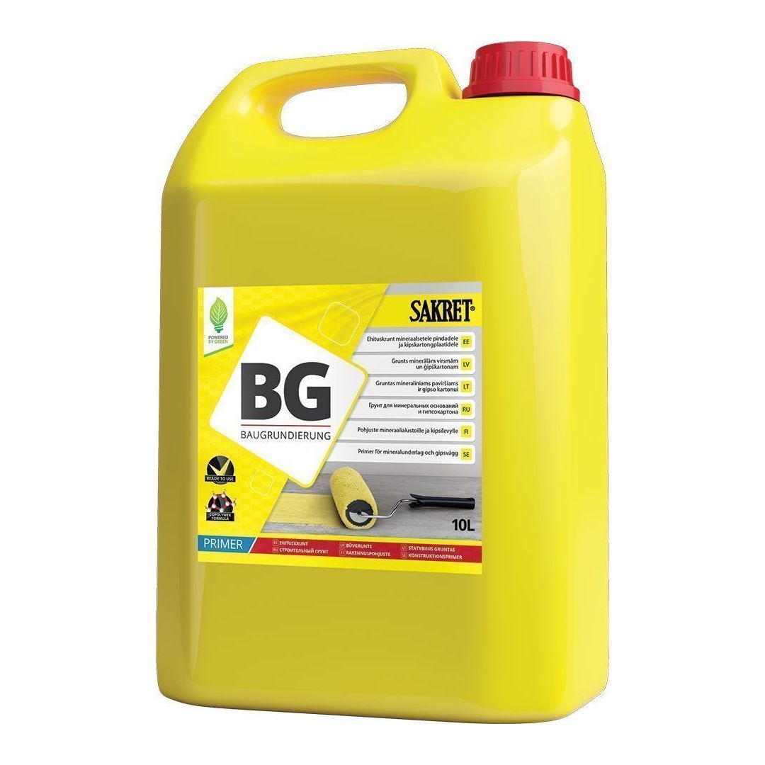Sakret BG on üldkrunt seintele, lagedele ja põrandatele sise- ja välitöödel. Kasutamiseks enne pahteldamis-, tapeetimis-, krohvimis ja värvimistöid mineraalsetel aluspindadel, kipsplaatidel. Eriti sobilik poorbetoonile<br /><br />Kasutusvalmis ja vee baasil BG parandab aluspinna nakkuvust, vähendab ja ühtlustab aluspinna imavusvõimet. <br /><br /><b>Kasutamisjuhend</b><br />Pind peab olema puhas ja kuiv. Pind puhastada lahtistest osakestest, liimist, õlist, lubjast ja kooruvast värvist. Enne kasutamist segada. Krunt kanda aluspinnale lahjendamata kujul pintsli, maalrirulli või pihustiga. Sõltuvalt imavusest kanda pinnale mitu kihti. Kuivamisaeg sõltuvalt aluspinna ja õhutemperatuurist 30 min - 2 h. Töövahendid pesta kohe peale kruntimist veega.<br /><br />• Konsistents: vedelik<br />• Värvus/läige: piimjas<br />• pH: 9-10 <br />• Kulunorm: 150-250 ml/m²<br />• Säilivusaeg: tihedalt suletud taaras 12 kuud alates tootmiskuupäevast