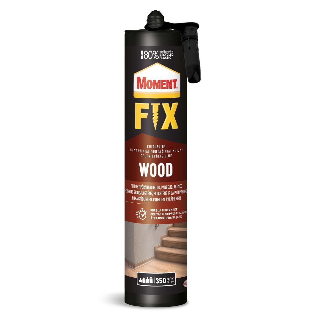 Moment FIX Wood on tugevalt puiduga nakkuv professionaalne ehitusliim siseruumides kasutamiseks. Sobib järgmistele pindadele: puit ja puitmaterjalid (nt paneelid, profiilid, puitlaastplaadid), krohvid (sisetingimustes), betoon, poorbetoon, pimss, kiudbetoon, telliskivid, stüreen-/kips-/papp-plaadid ja jäigad polüuretaanvahud. Saadaval taaskasutatud padrunis!<br /><br>Omadused:<br /><br>• Imavatele pindadele siseruumides<br /><br>• Algne nakkuvus 350 kg/m2*, kuivatamise ajal ei ole vaja esemeid toetada mehaaniliste kinnitustega<br /><br>• Väga hea nakkuvus, eriti puiduga<br /><br>• Ei sisalda lahusteid – sobib ideaalselt ka tundlikele pindadele (nt Styrofoam)<br /><br>• Ei lõhna – ideaalne ka asustatud korteritesse/majadesse<br /><br>• Pärast kuivamist ülevärvitav<br /><br>•Pindadelt lihtsalt ja kiiresti puhastatav <br /><br>• Imavatel pindadel kiiresti kuivav<br /><br>• Pragusid täitev kuni 10 mm<br /><br>• 80% padrunist on valmistatud taaskasutatud plastist